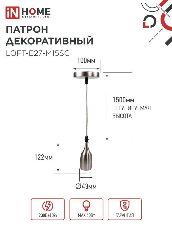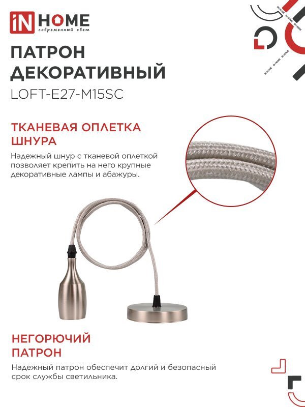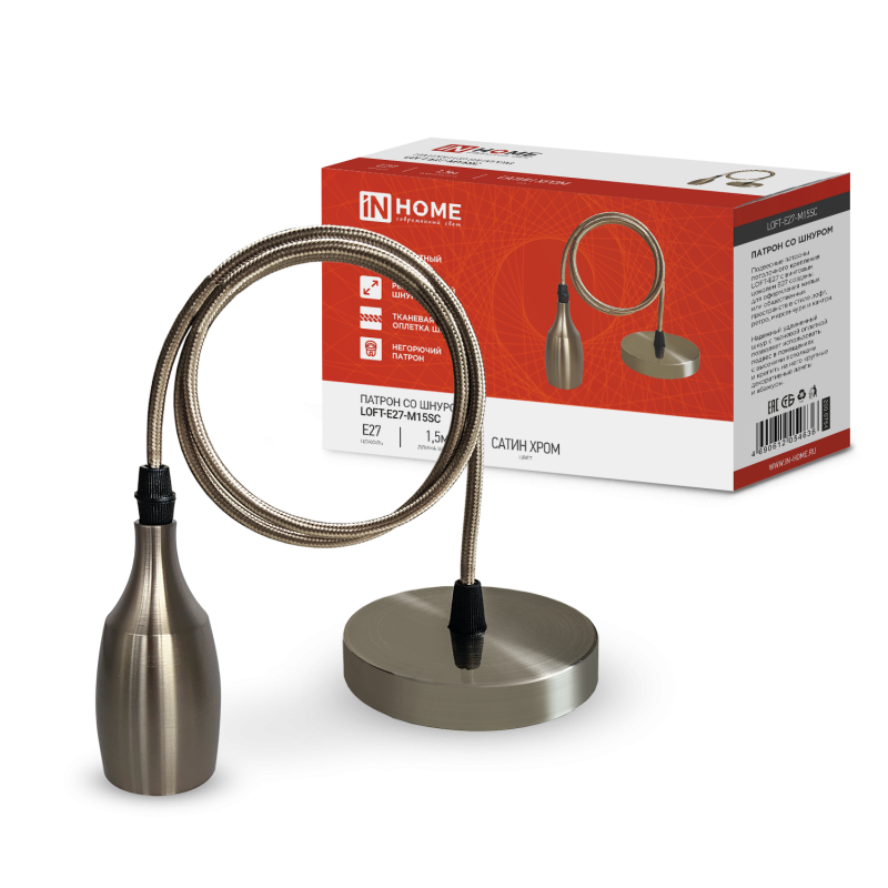Патрон LOFT-Е27-M15SC со шнуром 1.5м сатин хром IN HOME 4690612054636