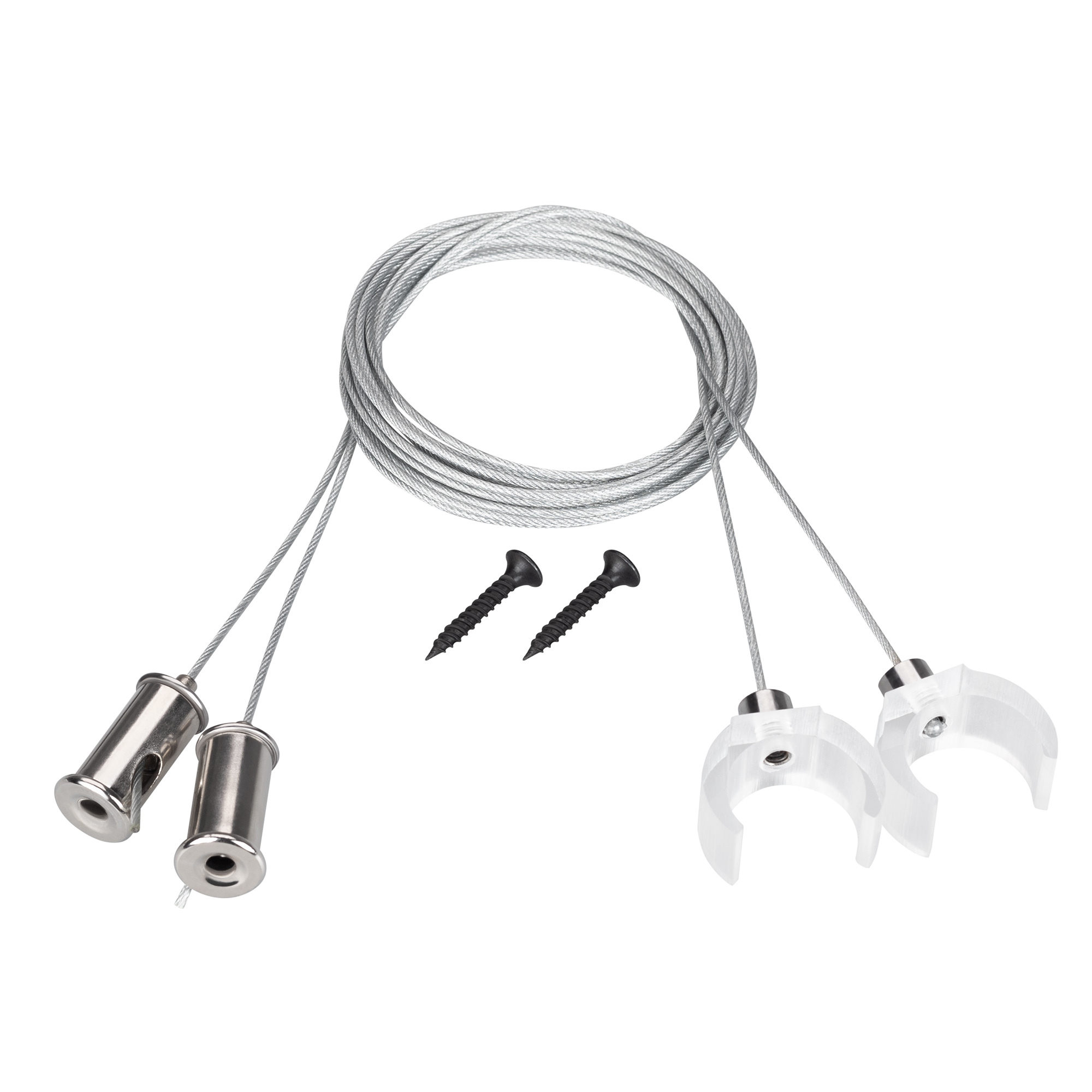 Подвес для профиля WPH-FLEX-D22. В комплекте: стальной трос 2 м серебристого цвета - 2 шт., прозрачный пластиковый держатель - 2 шт., шуруп - 2 шт. Максимальная нагрузка на 1 трос 2 кг. Цена за комплект.