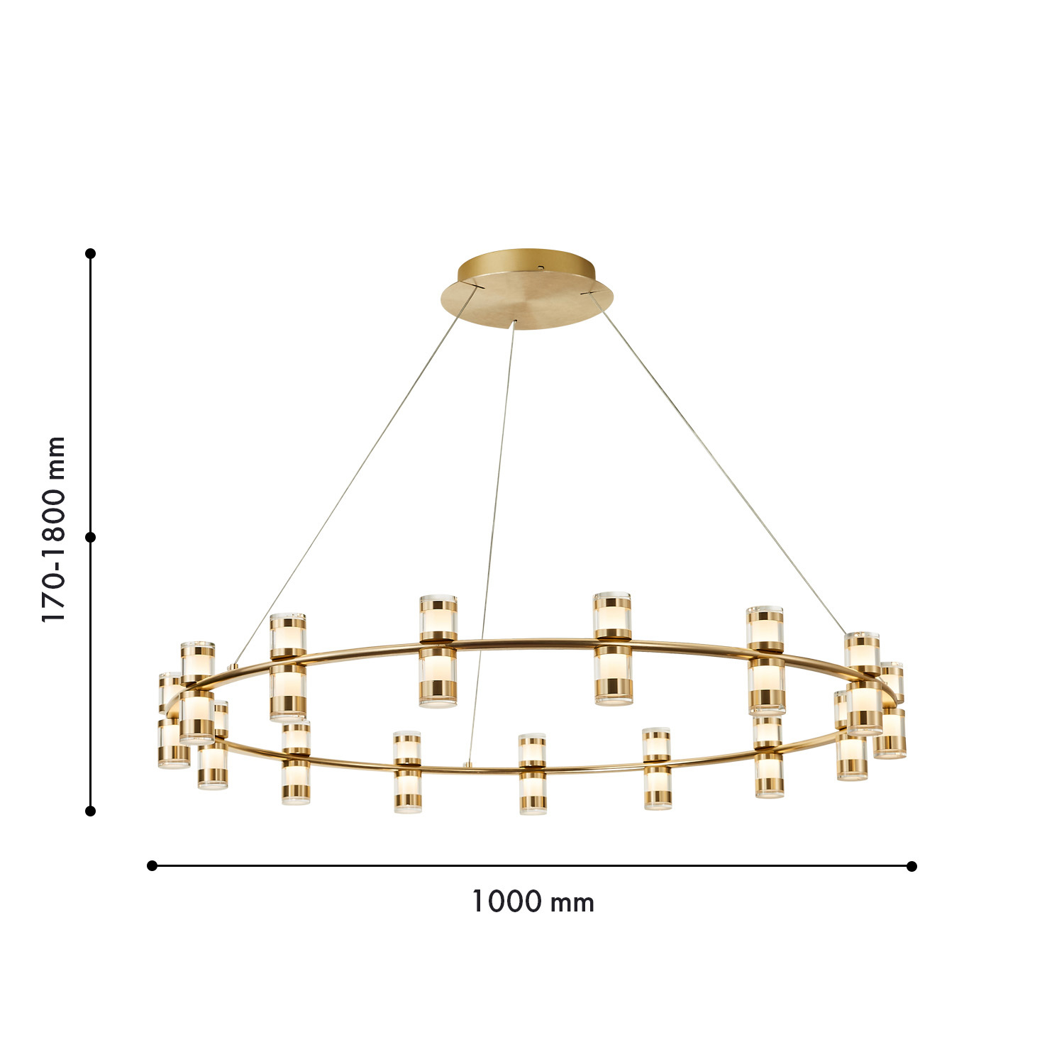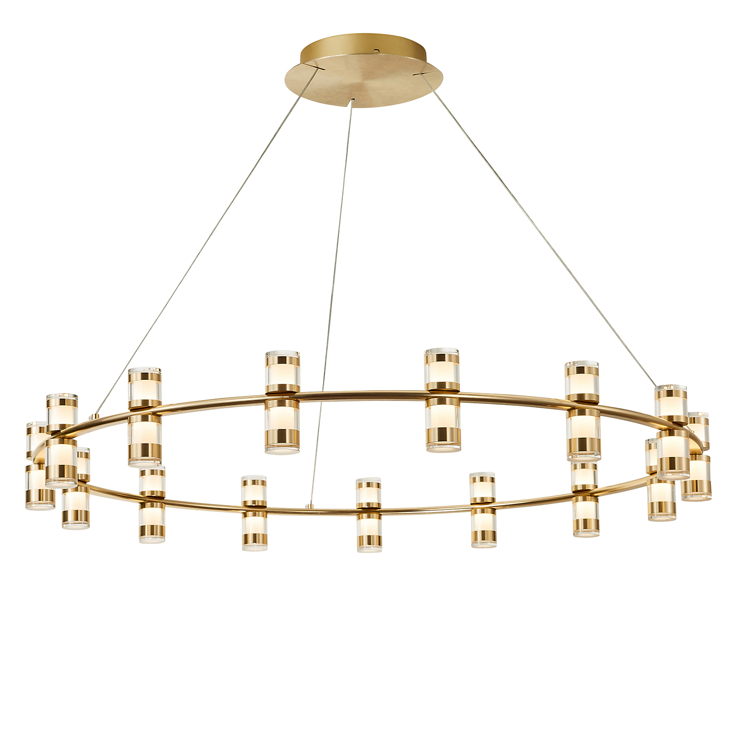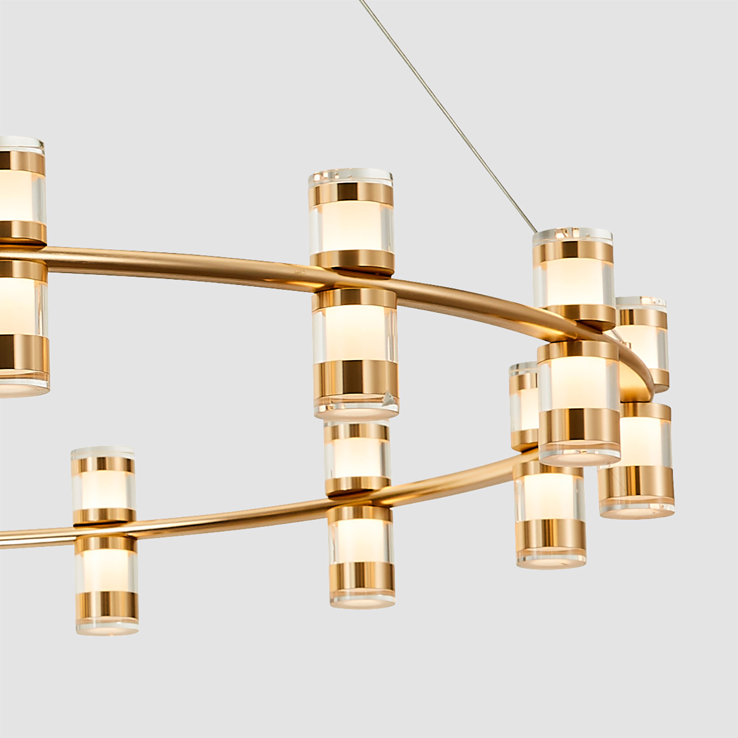 Подвесная люстра, каркас в цвете золото, оснащена двусторонним многослойным стеклянным плафоном с светящимся цилиндром внутри и золотыми декоративными ободками по кругу. Свет от плафонов направлен как вниз, так и вверх, встроенные LED-модули