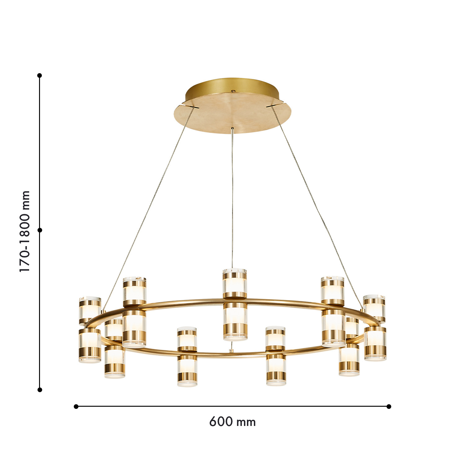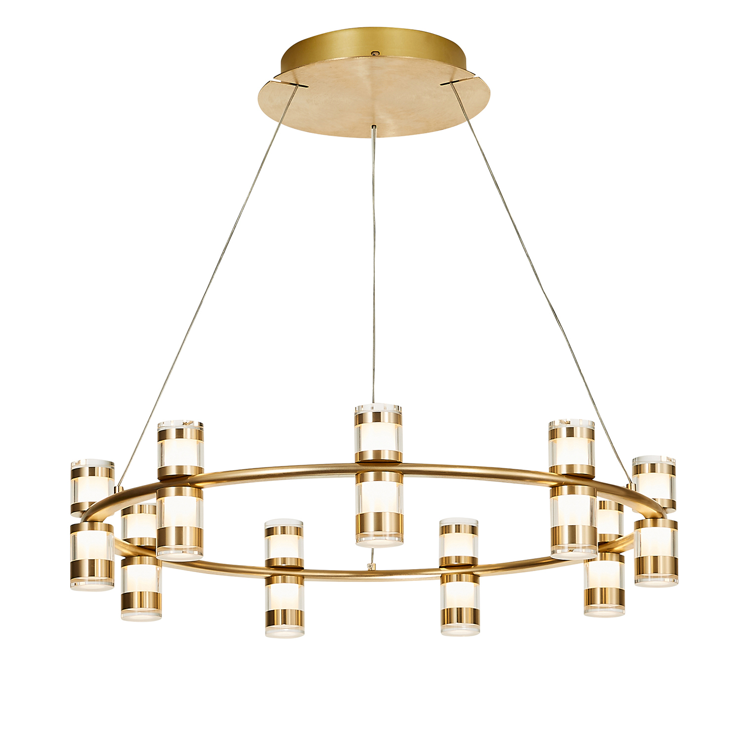 Подвесная люстра, каркас в цвете золото, оснащена двусторонним многослойным стеклянным плафоном с светящимся цилиндром внутри и золотыми декоративными ободками по кругу. Свет от плафонов направлен как вниз, так и вверх, встроенные LED-модули
