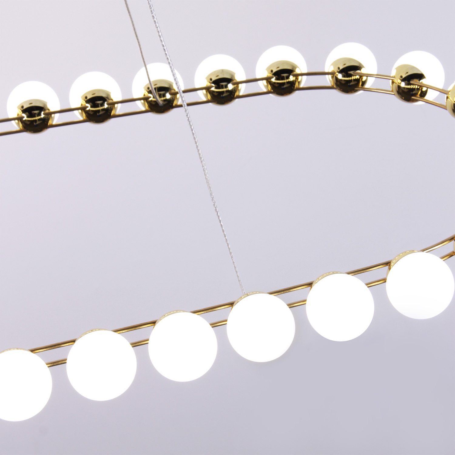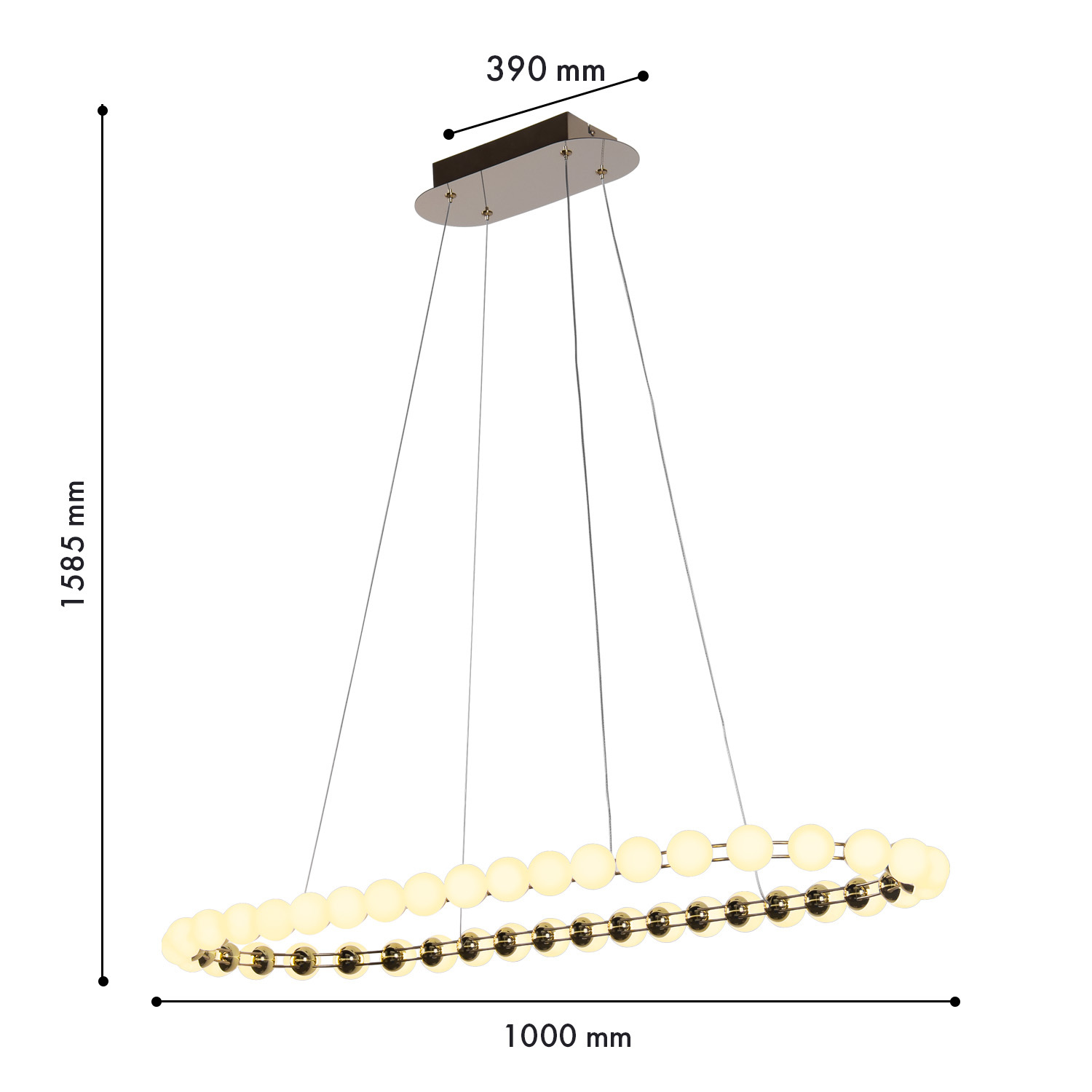 Подвесная люстра длиной 100 см с каркасом в цвете латунь, плафоны в форме белых акриловых шариков
