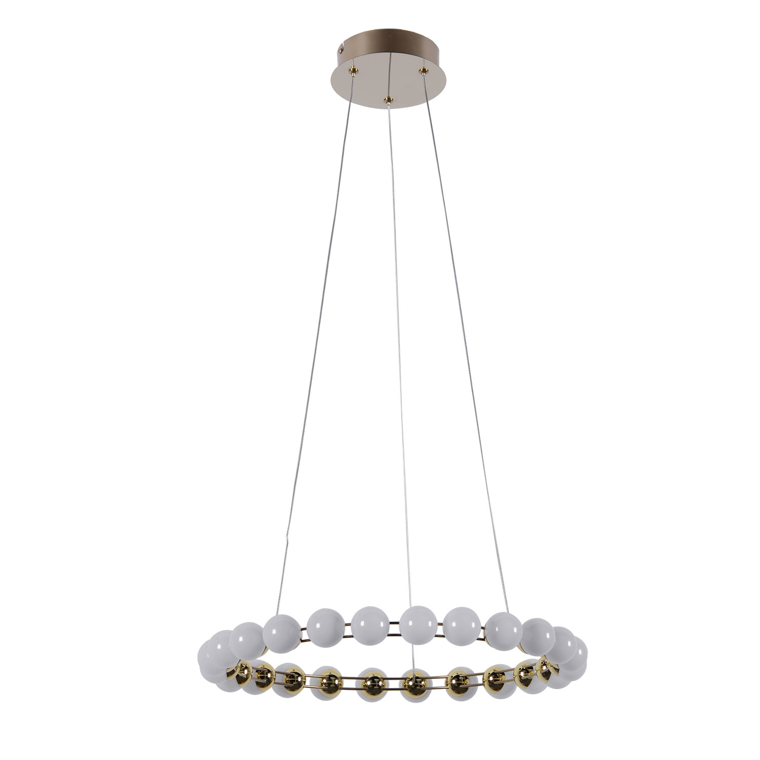 Подвесная люстра диаметром 48 см с каркасом в цвете латунь, плафоны в форме белых акриловых шариков