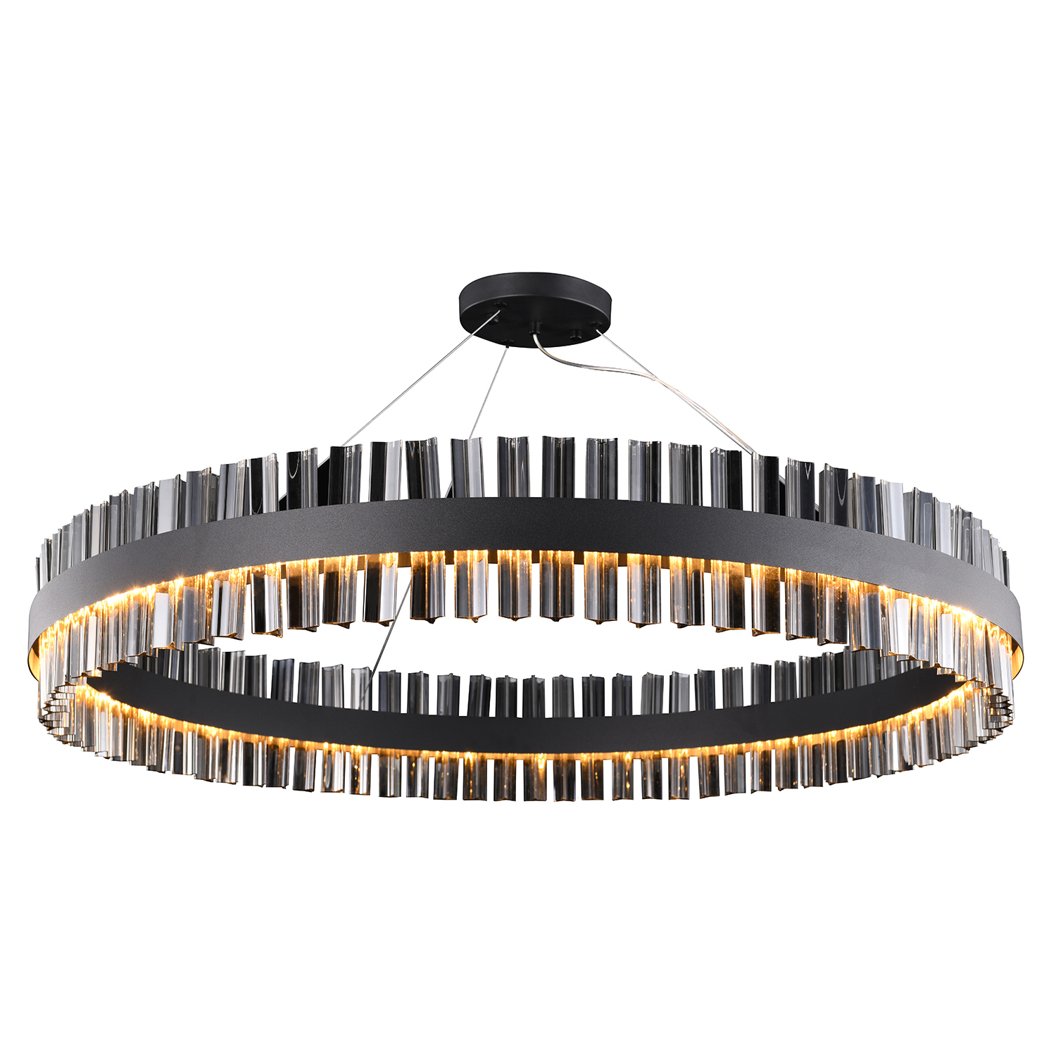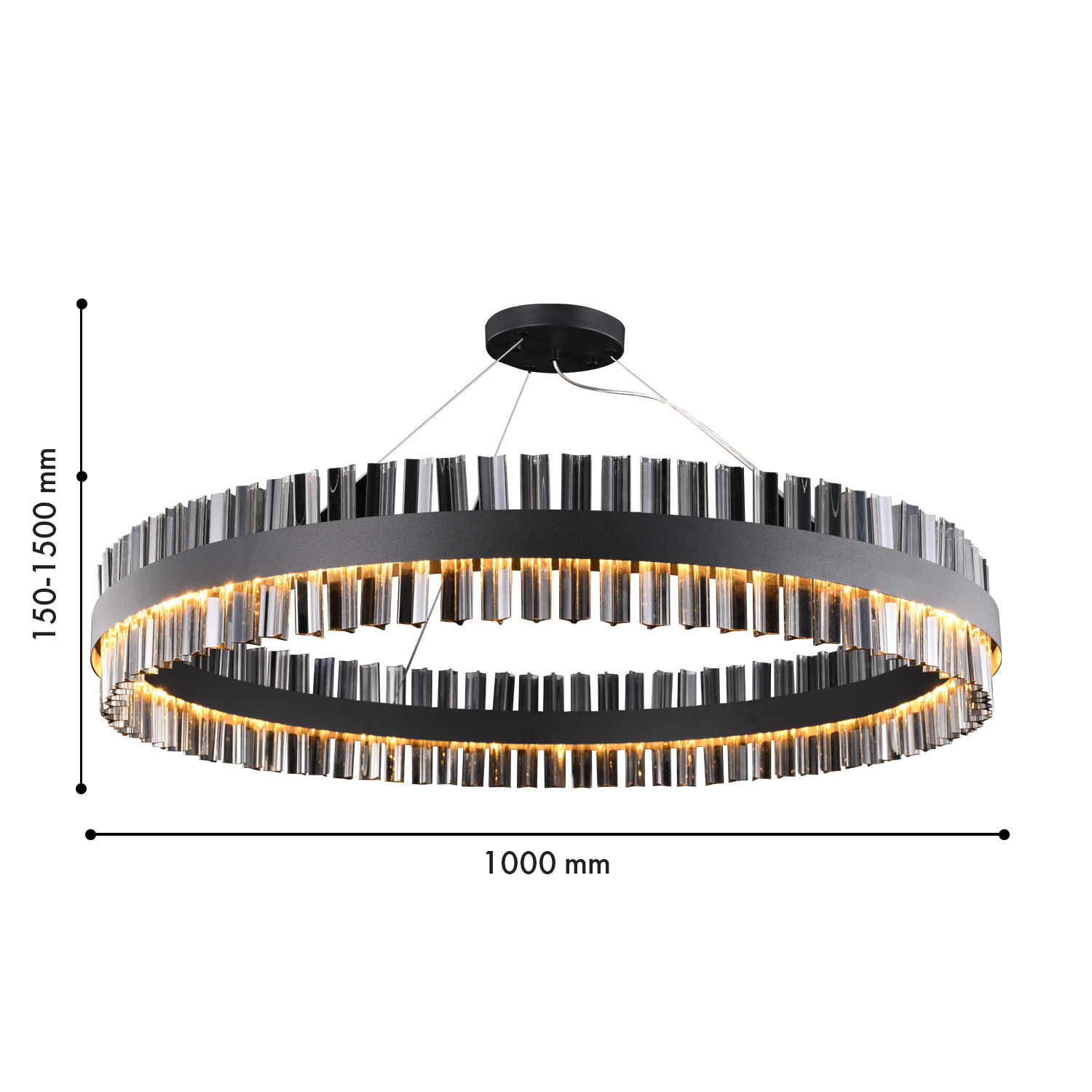 Подвесная кольцевая люстра диаметром 100 см сочетает дымчато-серый хрусталь и каркас в черном цвете, регулируемая высота, встроенная лента LED