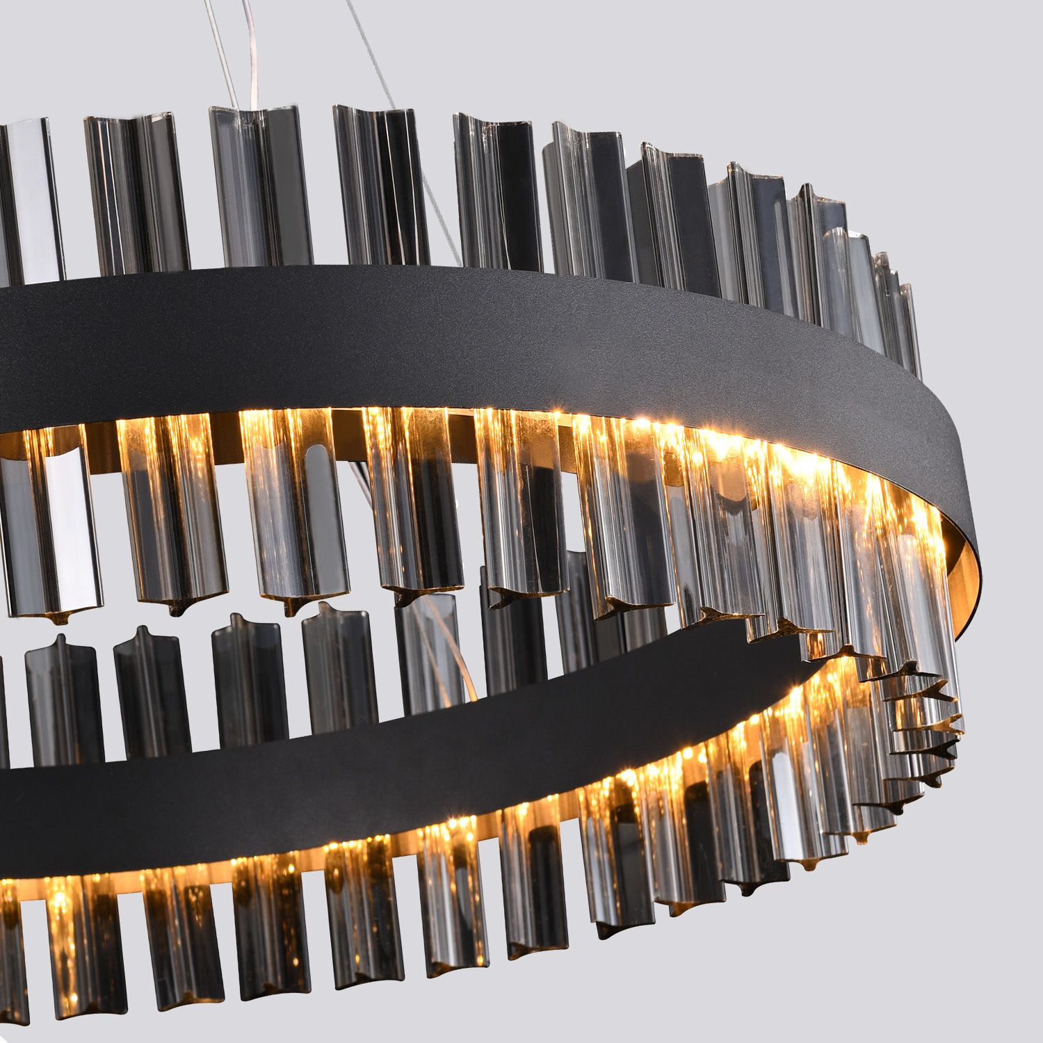 Подвесная кольцевая люстра диаметром 60 см, каркас в черном цвете, дымчато-серый хрусталь, регулируемая высота, встроенная лента LED