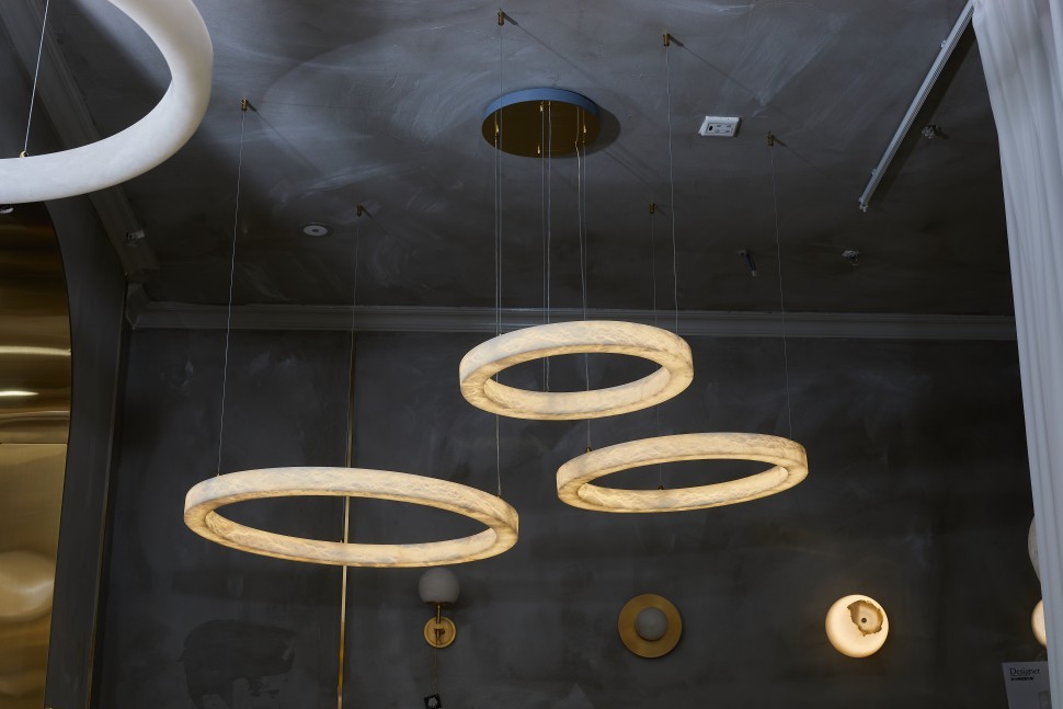 Плафоны выполнены из натурального камня – испанского алебастра. Корпус – из латуни. Сочетание этих материалов делает светильники прочными и долговечными.