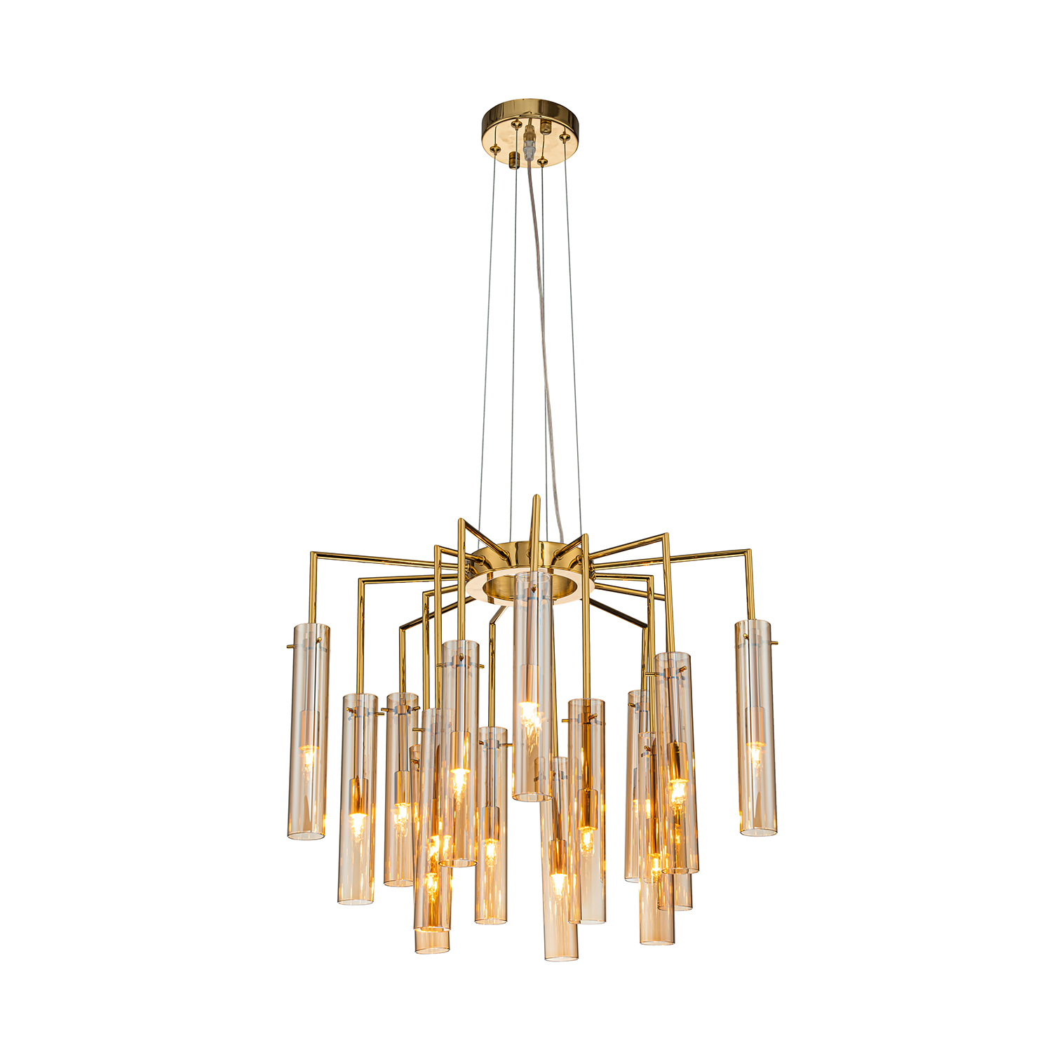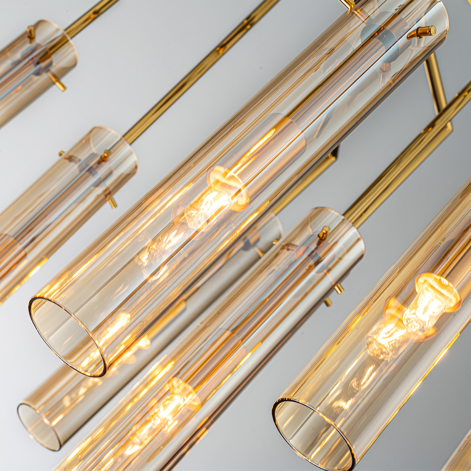 Каскадная подвесная люстра, каркас в цвете золото, состоит из металлических трубок, изогнутых от центрального кольца под прямым углом, на конце каждой трубки расположен тонкий длинный плафон из стекла янтарного цвета. сменная лампа G9, регулируемая высота.