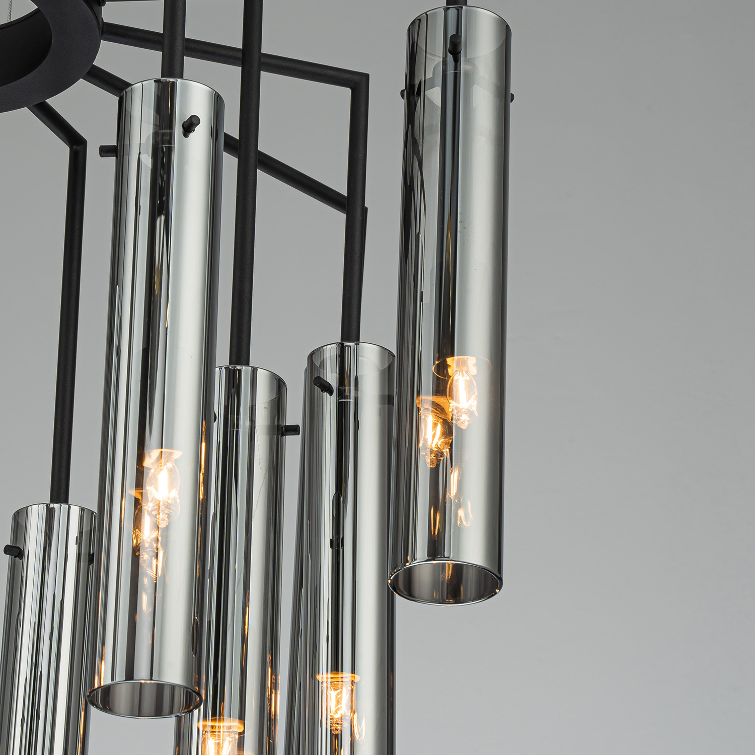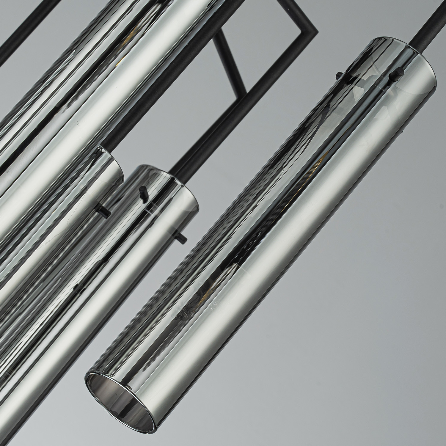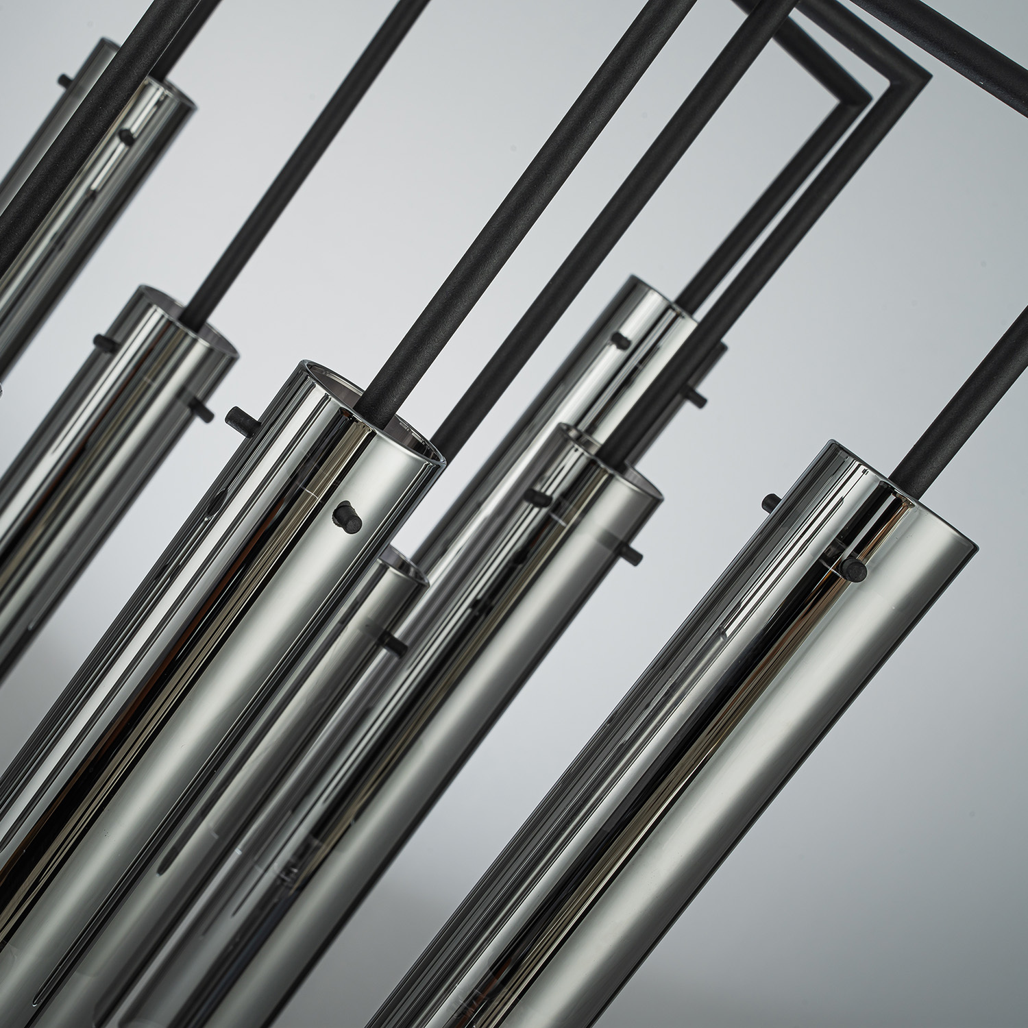 Каскадная подвесная люстра, каркас черного цвета, состоит из металлических трубок, изогнутых от центрального кольца под прямым углом, на конце каждой трубки расположен тонкий длинный плафон из стекла дымчато-серого цвета. сменная лампа G9, регулируемая высота.