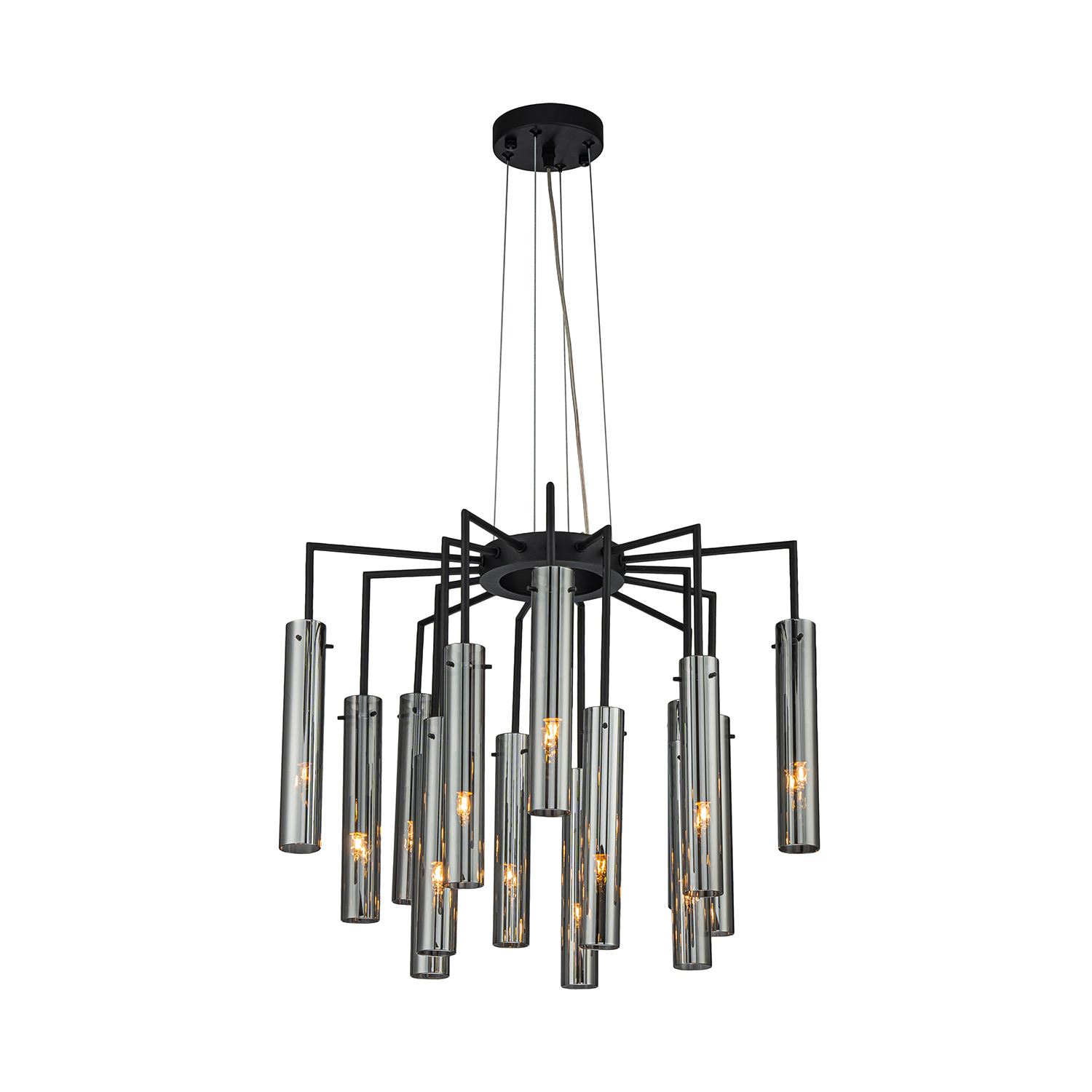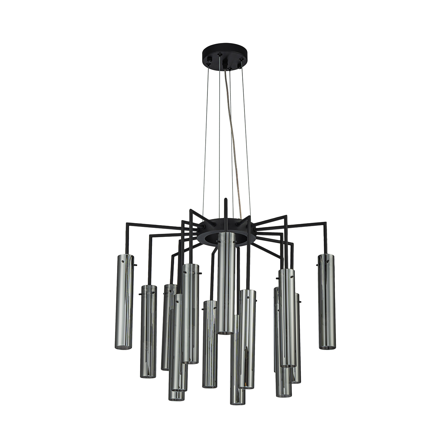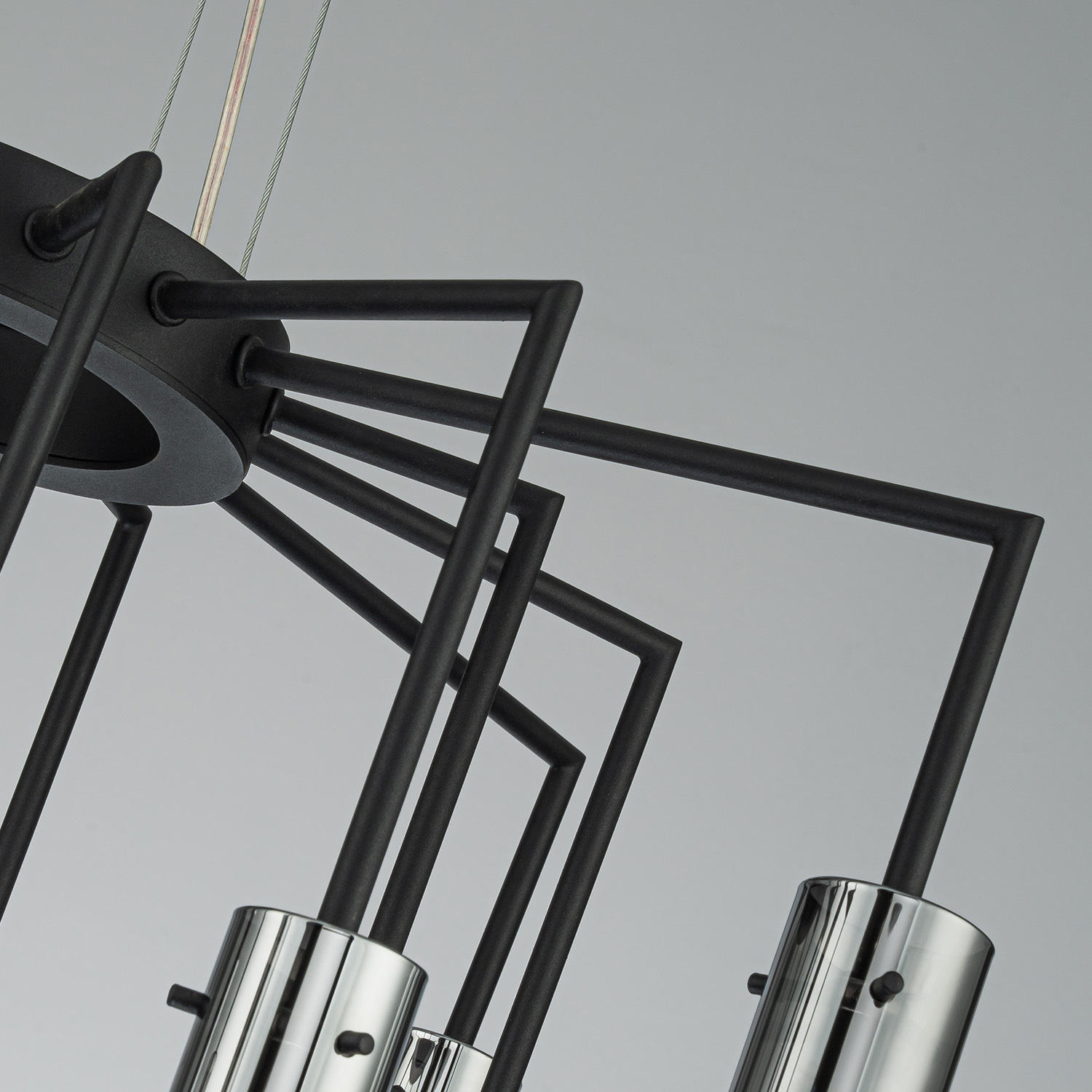 Каскадная подвесная люстра, каркас черного цвета, состоит из металлических трубок, изогнутых от центрального кольца под прямым углом, на конце каждой трубки расположен тонкий длинный плафон из стекла дымчато-серого цвета. сменная лампа G9, регулируемая высота.