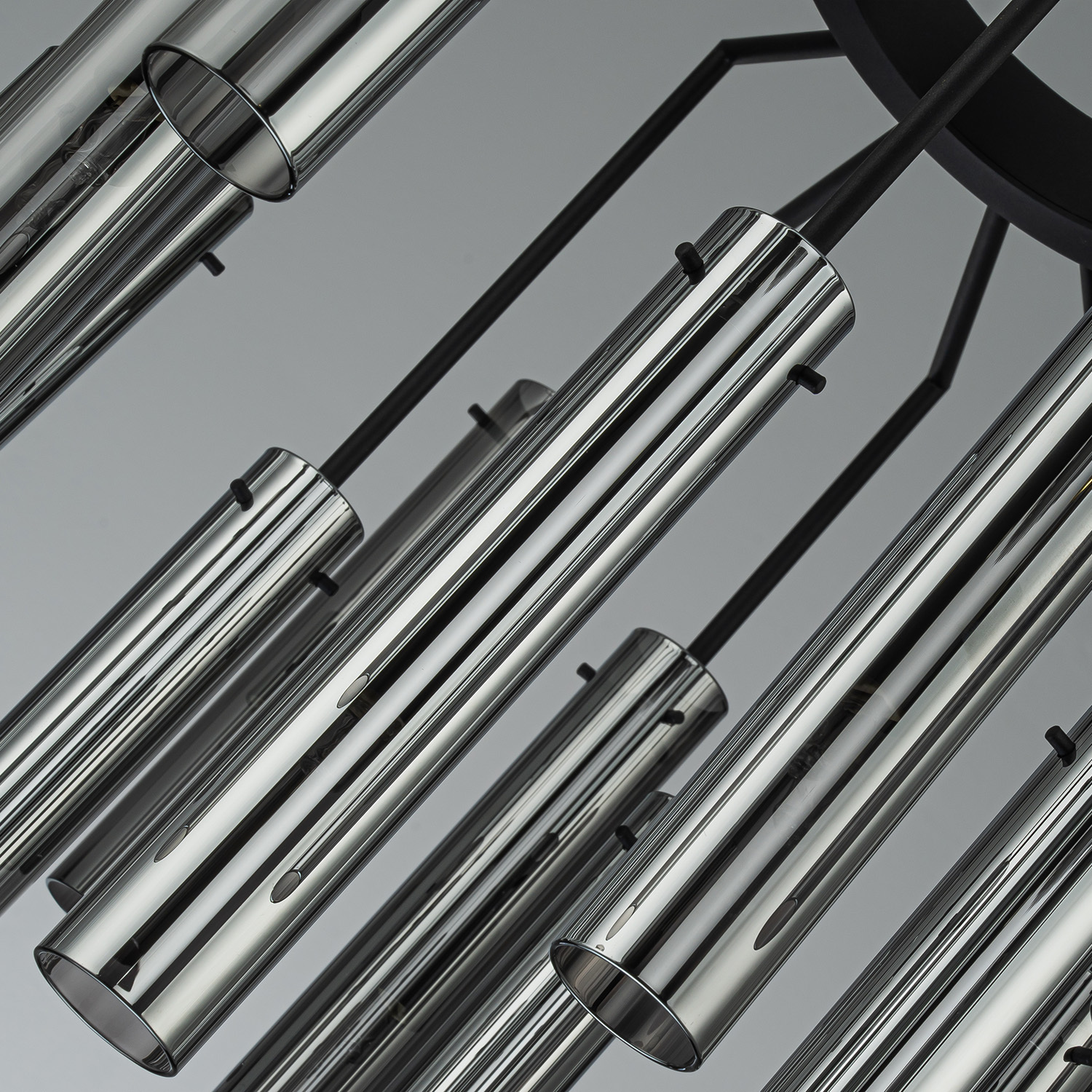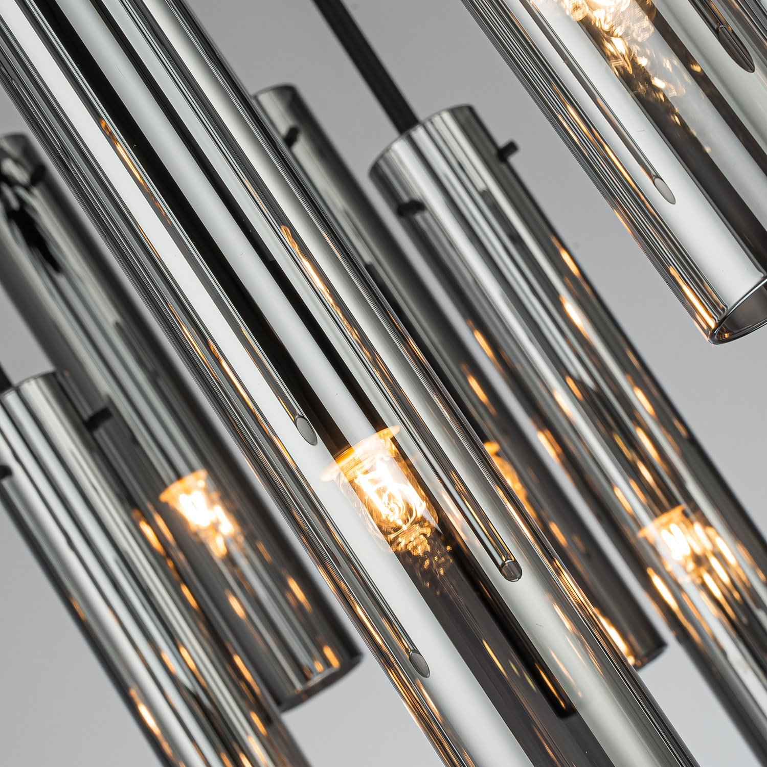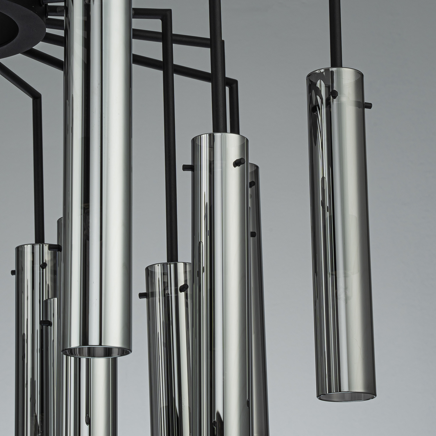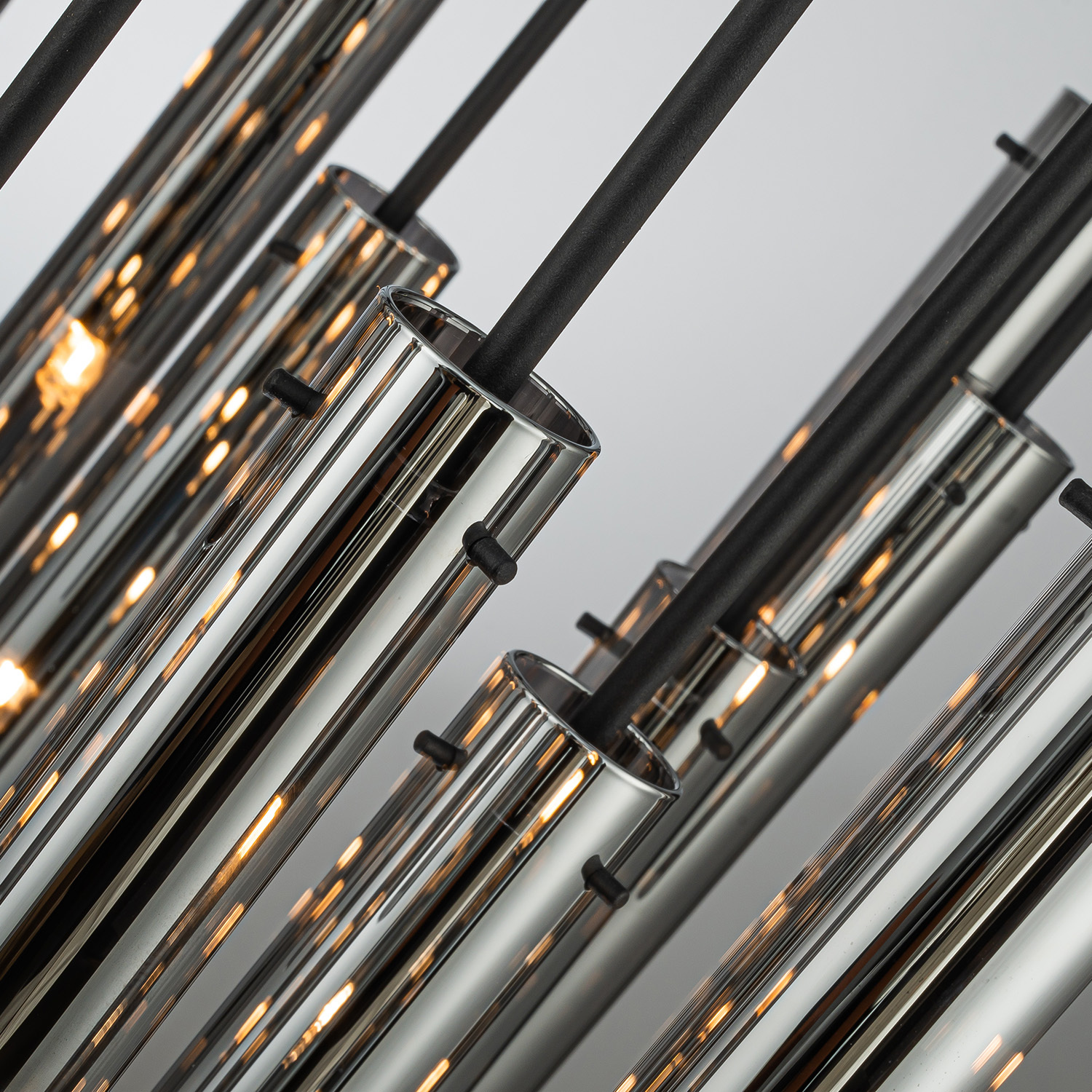 Каскадная подвесная люстра, каркас черного цвета, состоит из металлических трубок, изогнутых от центрального кольца под прямым углом, на конце каждой трубки расположен тонкий длинный плафон из стекла дымчато-серого цвета. сменная лампа G9, регулируемая высота.
