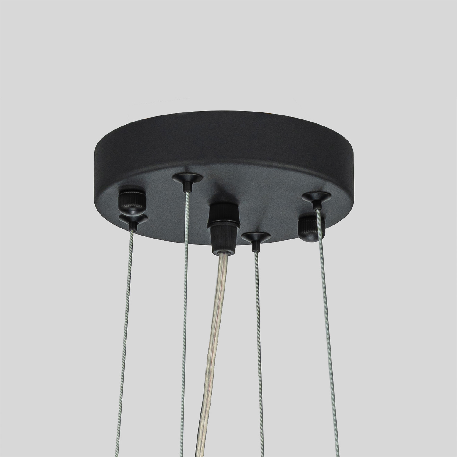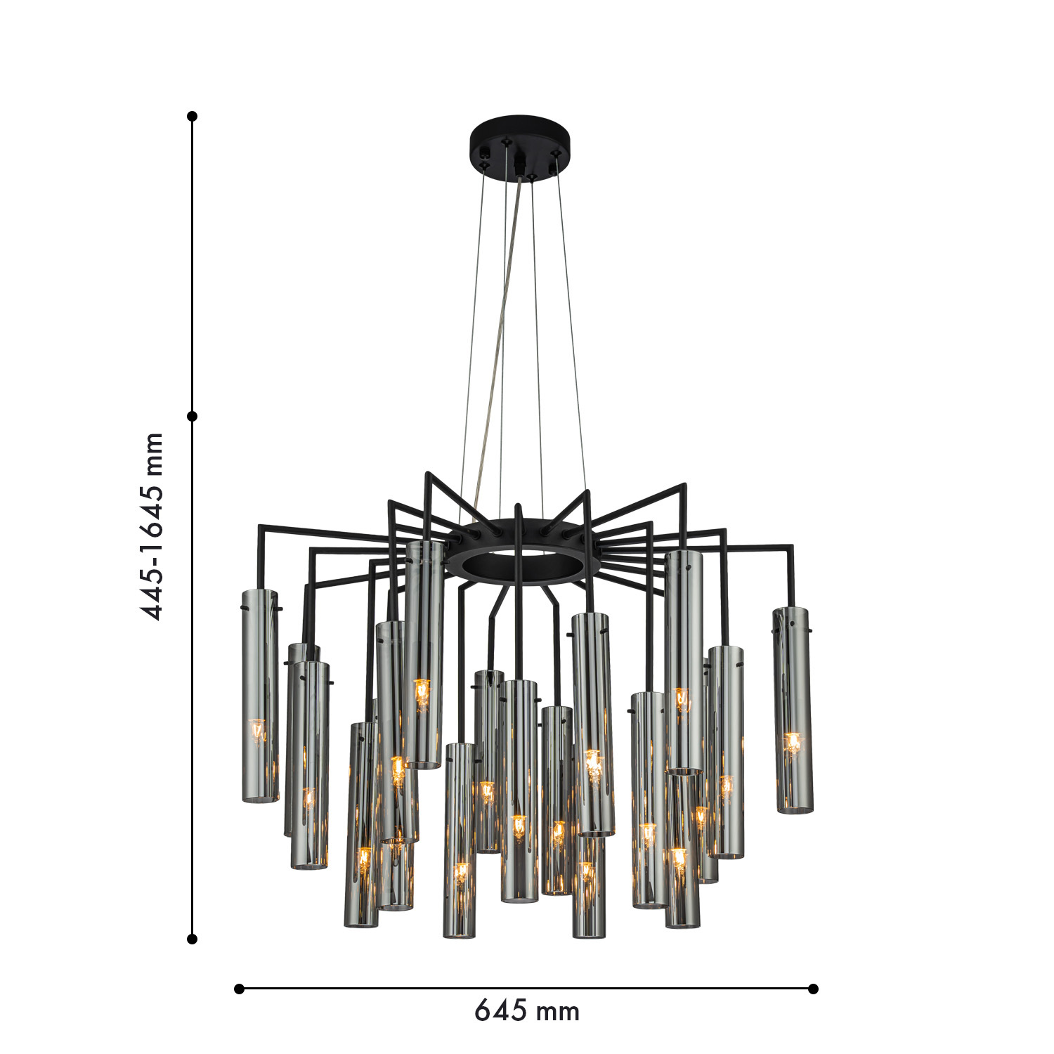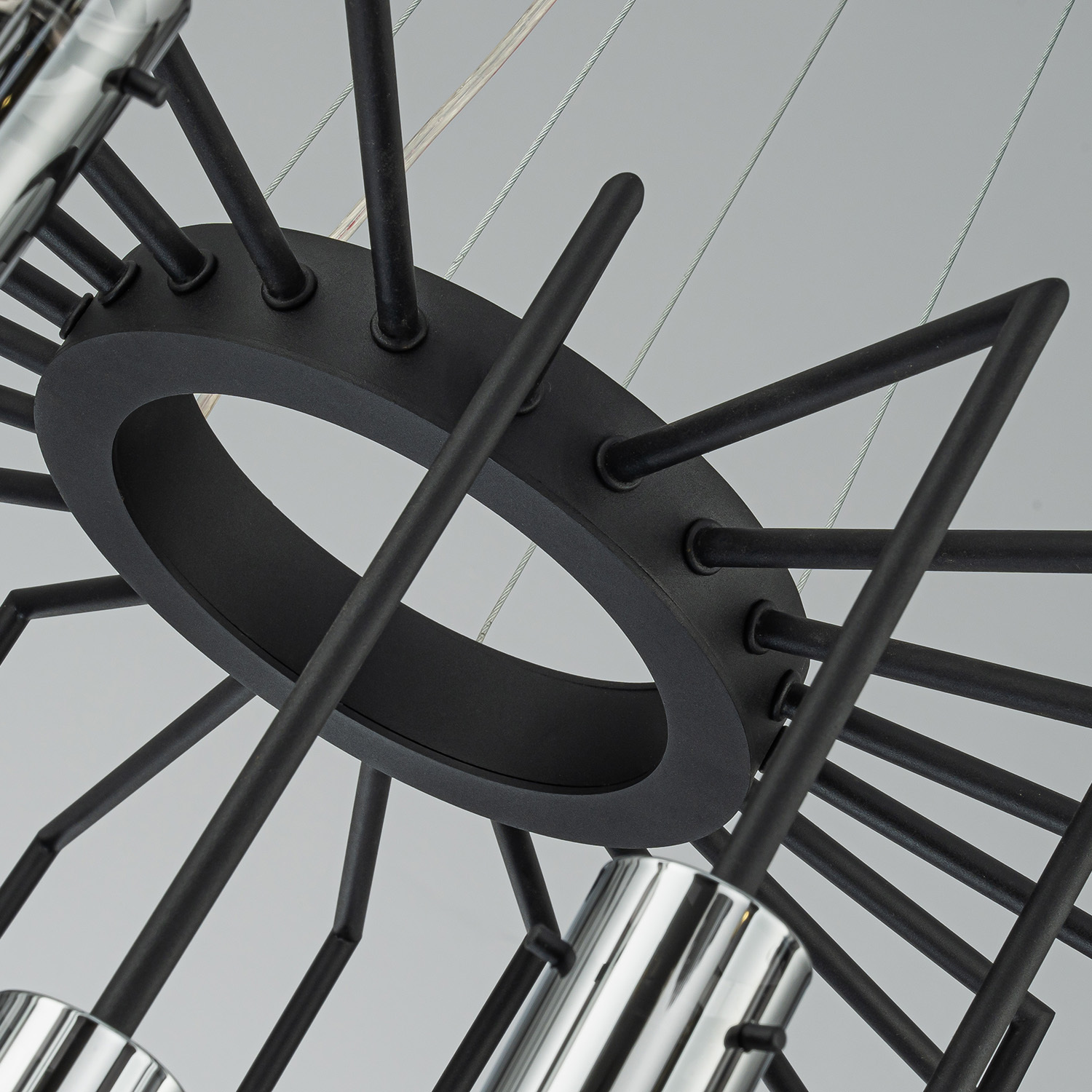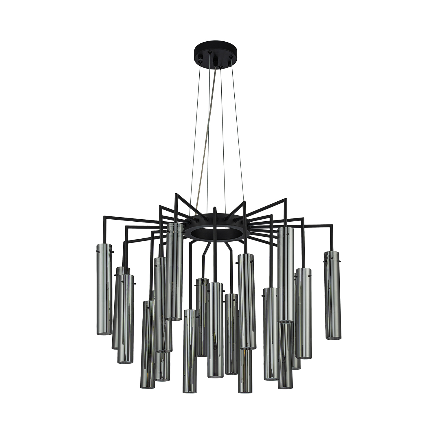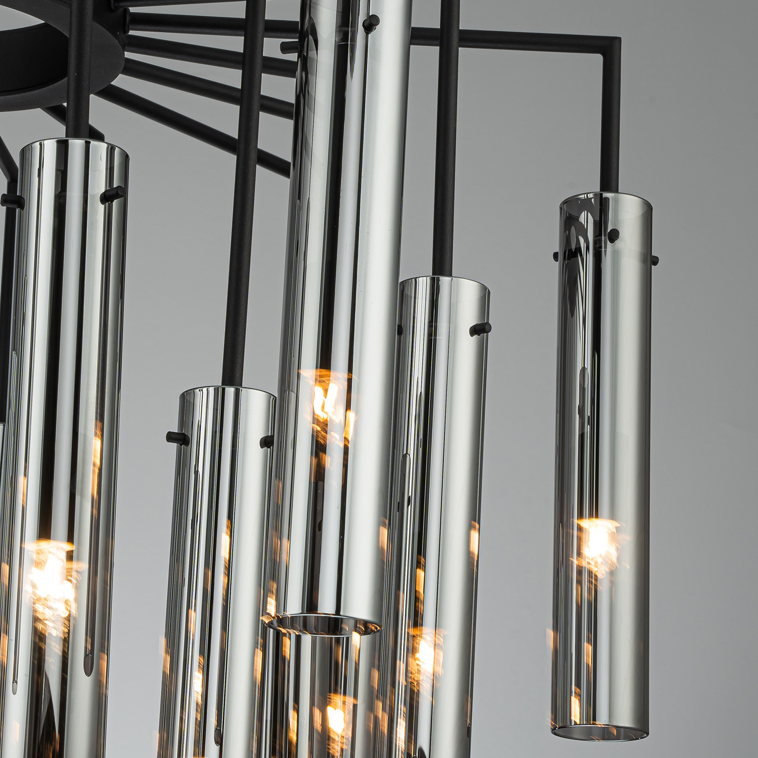 Каскадная подвесная люстра, каркас черного цвета, состоит из металлических трубок, изогнутых от центрального кольца под прямым углом, на конце каждой трубки расположен тонкий длинный плафон из стекла дымчато-серого цвета. сменная лампа G9, регулируемая высота.