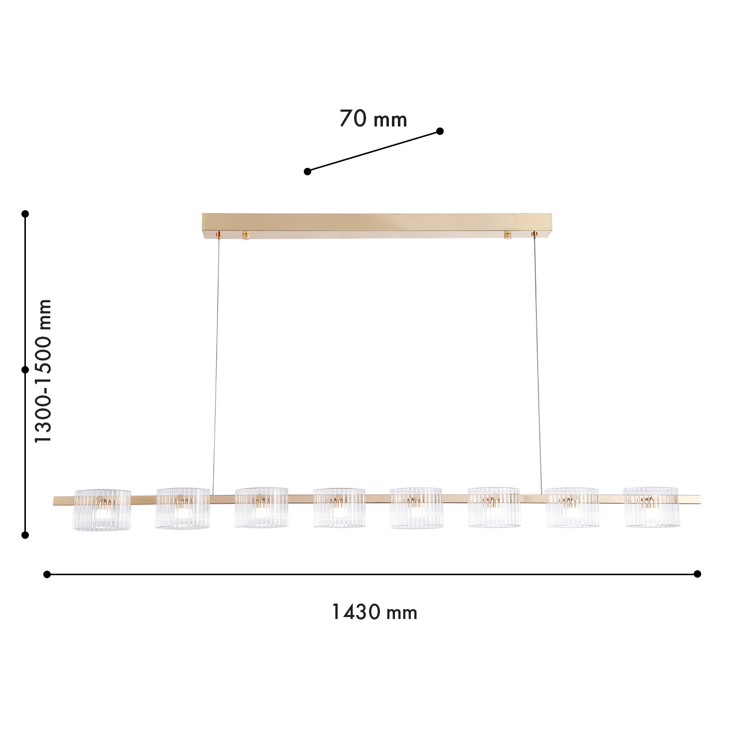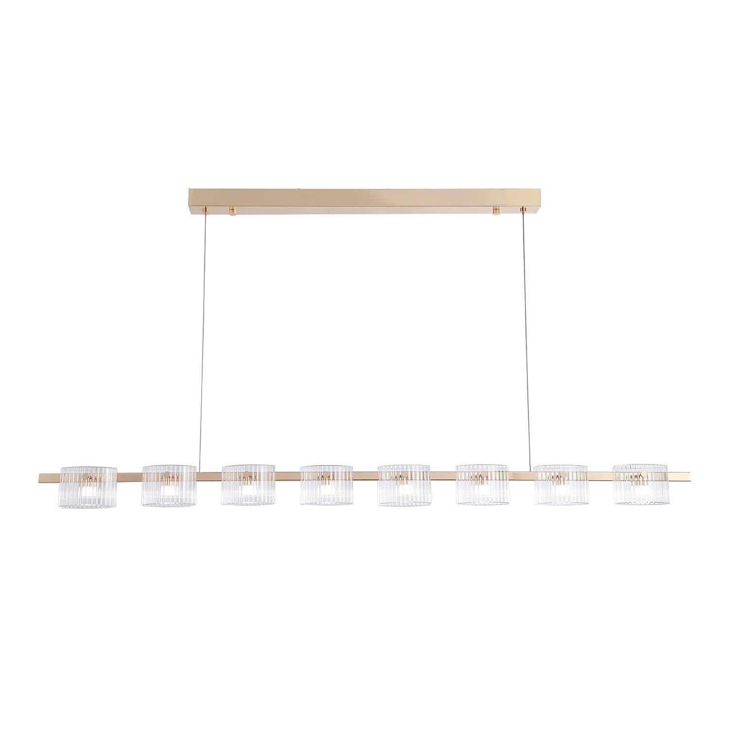 Подвесная люстра длиной 143 см с прозрачными рифлеными плафонами, каждый из которых состоит из двух слегка выгнутых стекол, закрепленных на заклепках с обеих сторон, каркас в золотом цвете, модуль LED, регулируемая высота