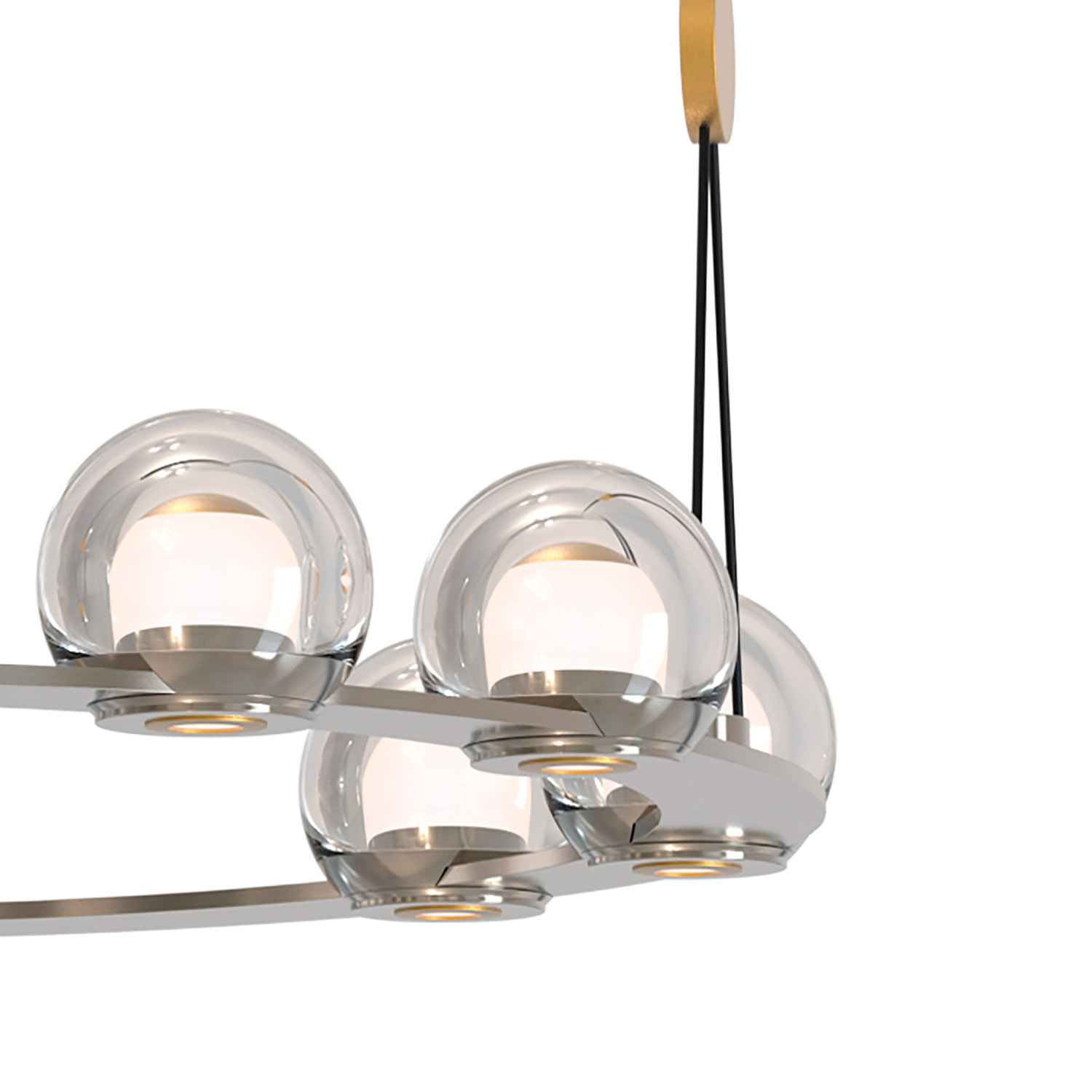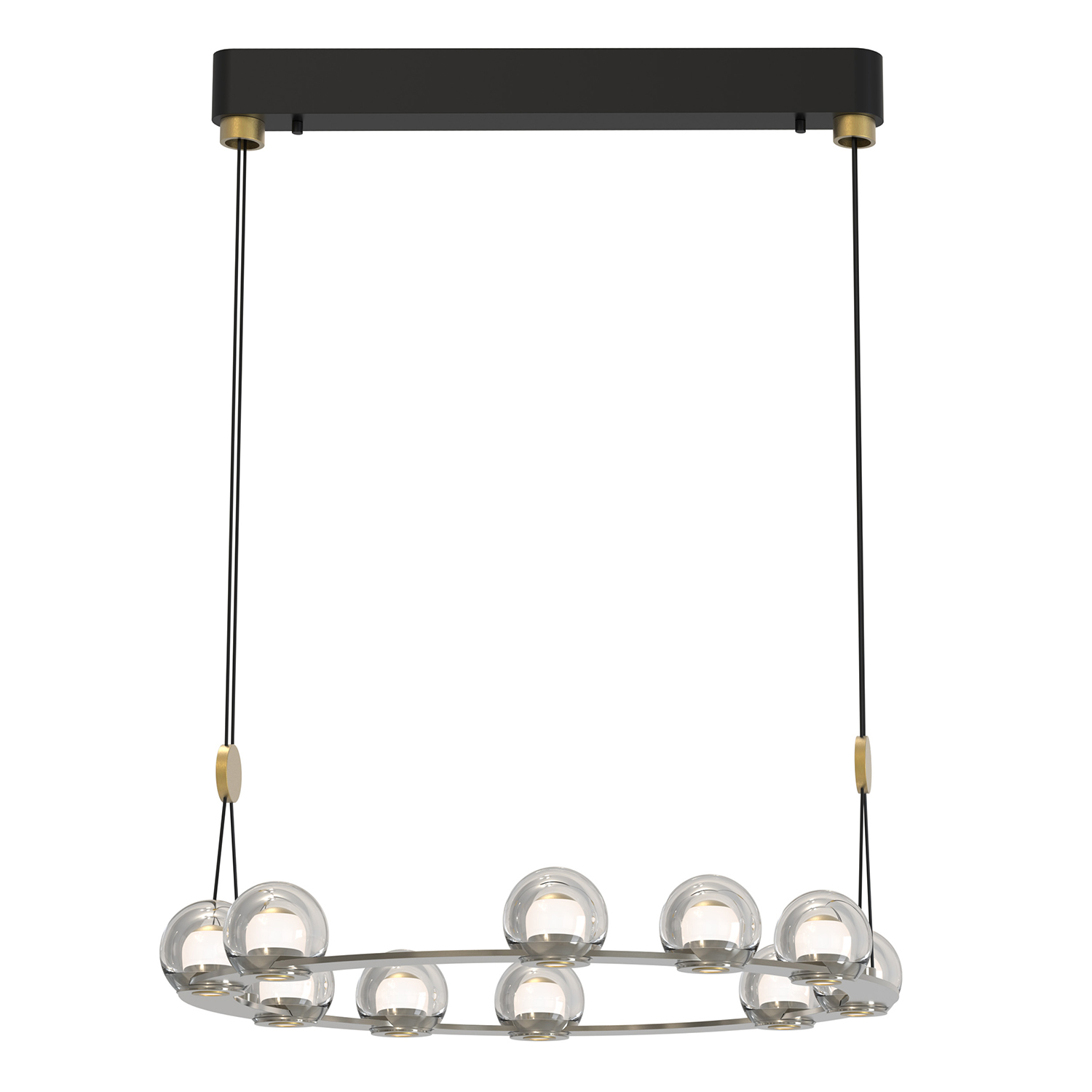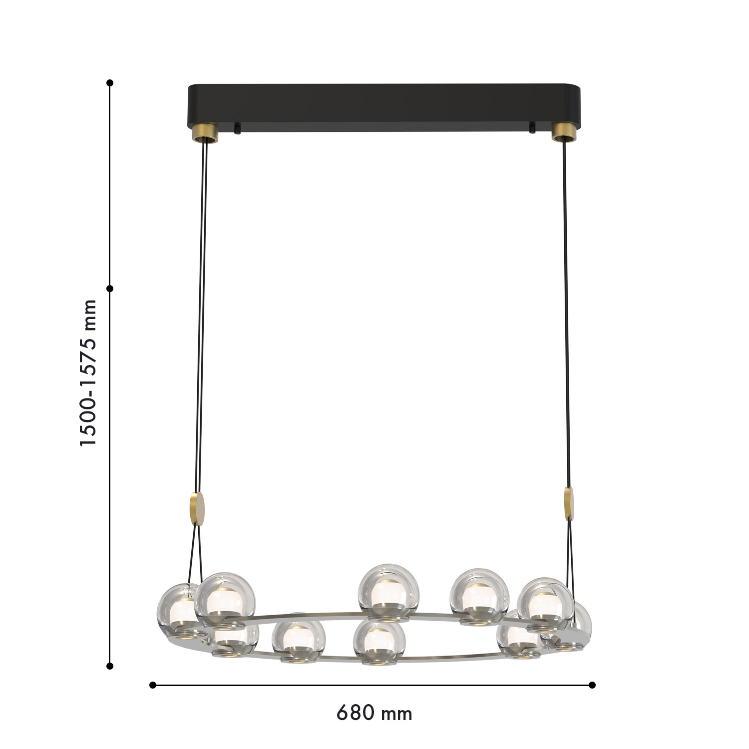 Подвесная люстра с черным каркасом, диаметром 68 см со сферическими плафонами, двойной источник света - внутри стеклянного плафона свет направлен вверх, спот в нижней части плафона светит вниз, регулируемая высота