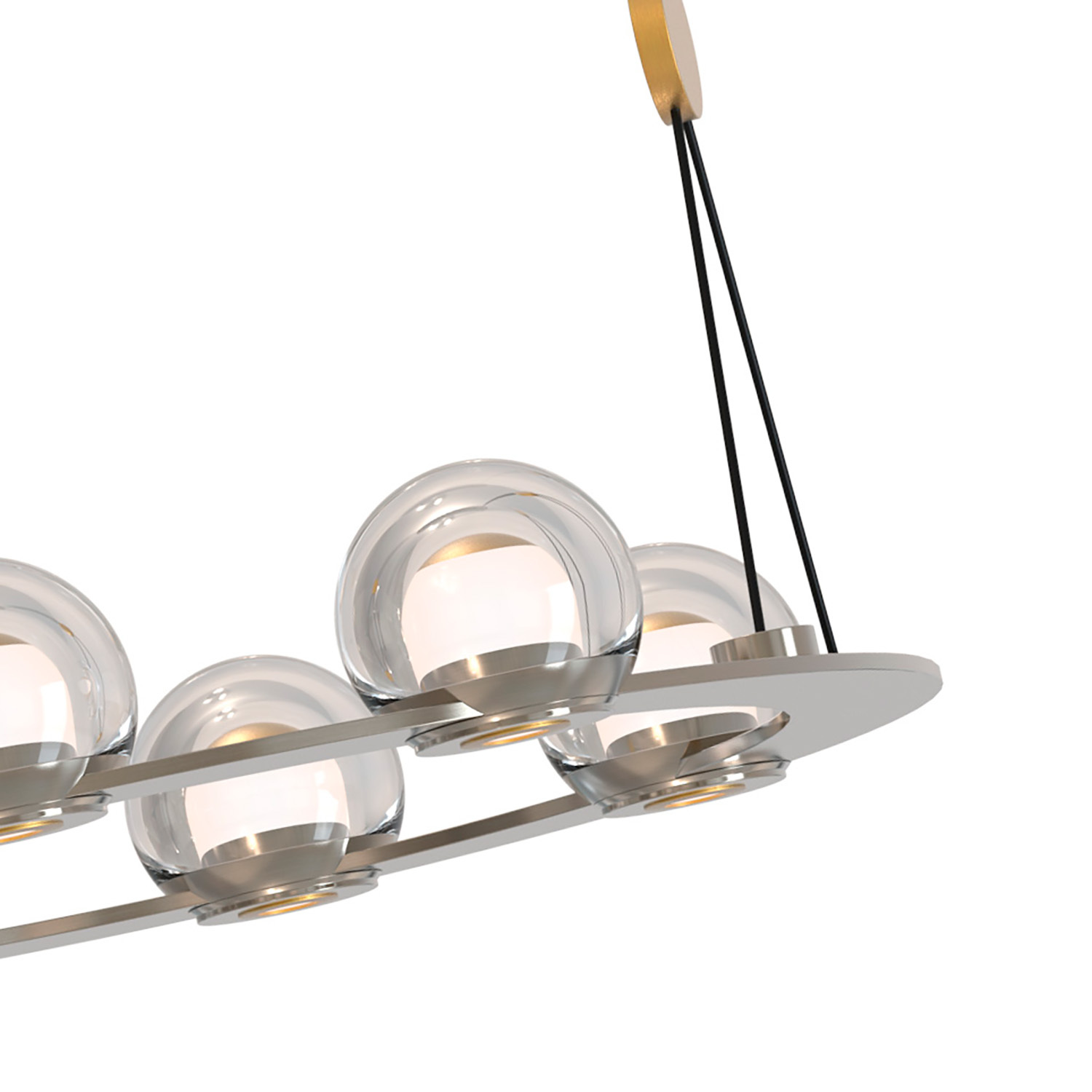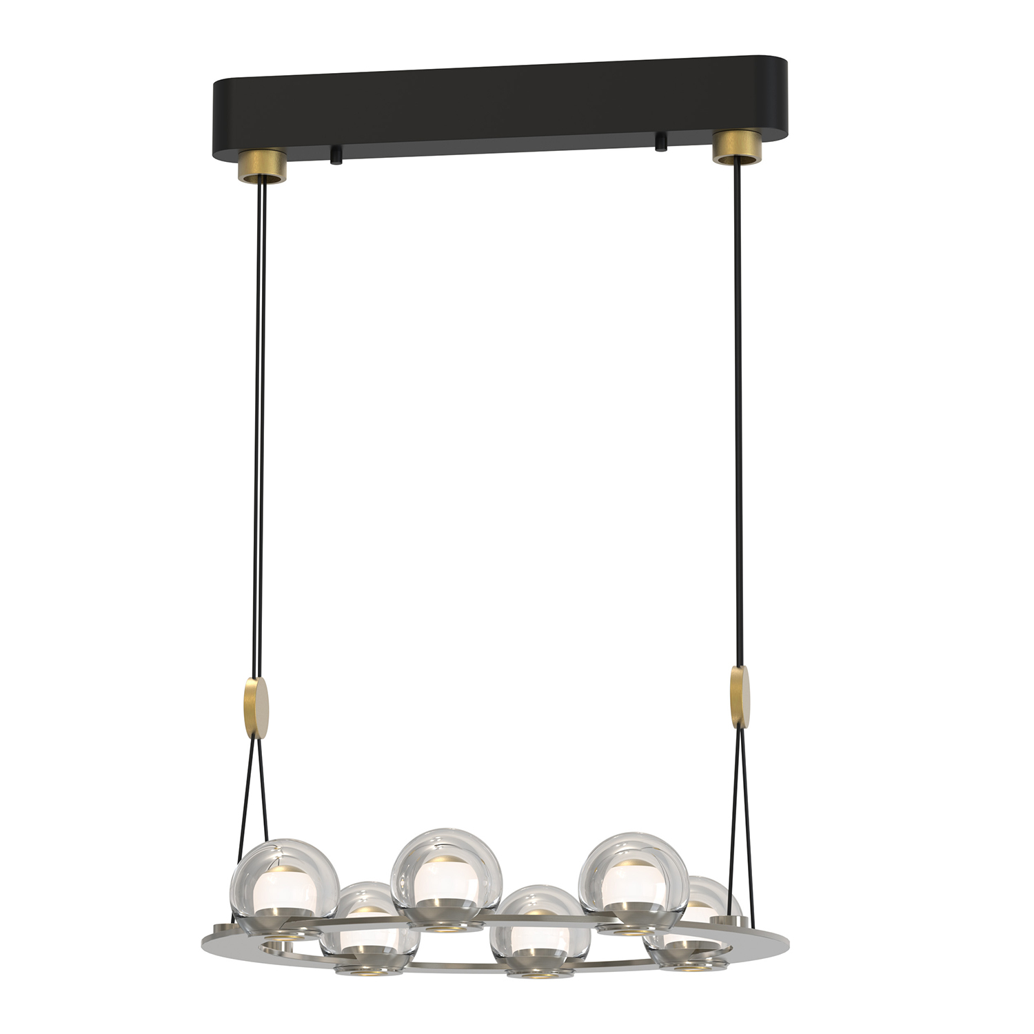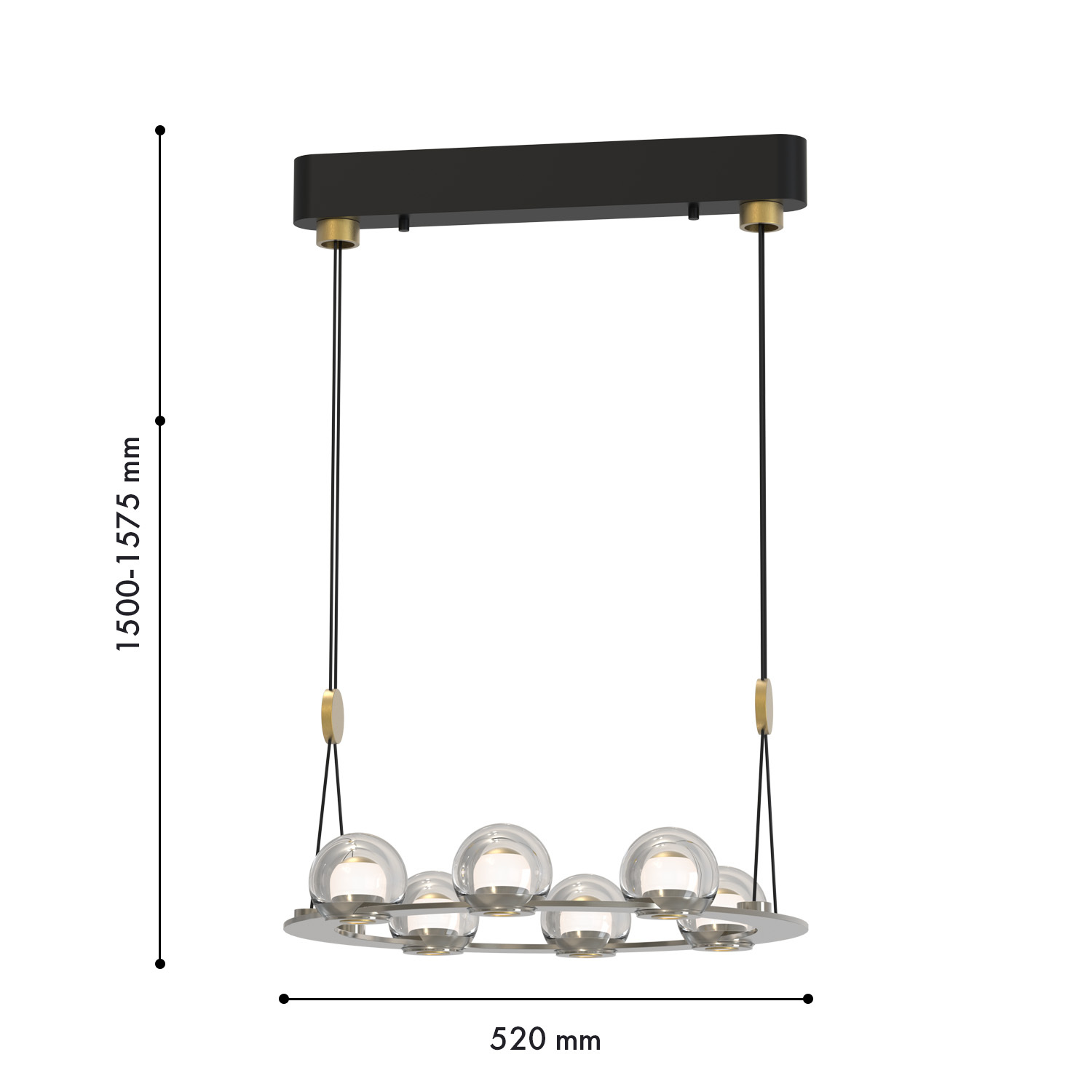 Подвесная люстра с черным каркасом, диаметром 52 см см со сферическими плафонами, двойной источник света - внутри стеклянного плафона свет направлен вверх, спот в нижней части плафона светит вниз, регулируемая высота