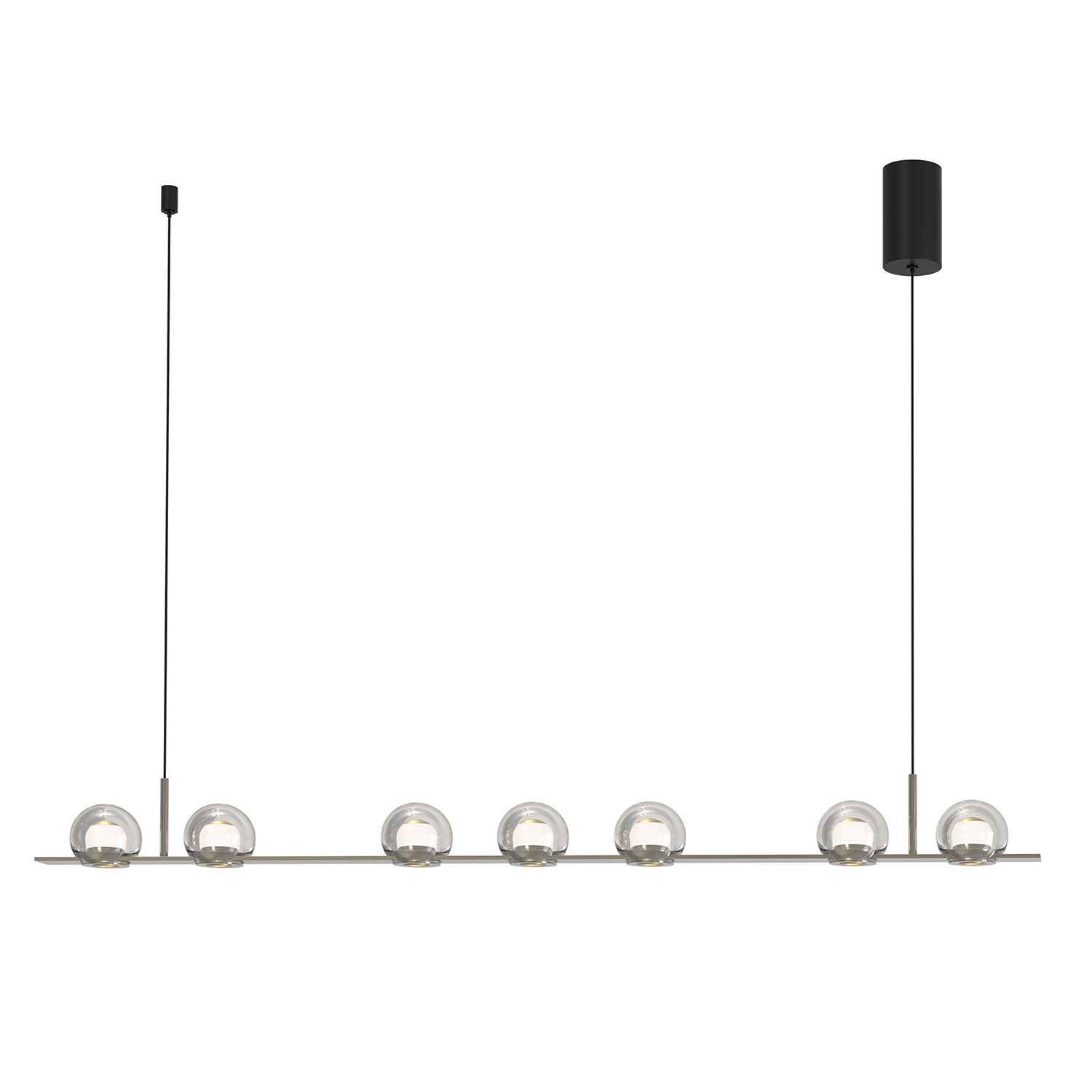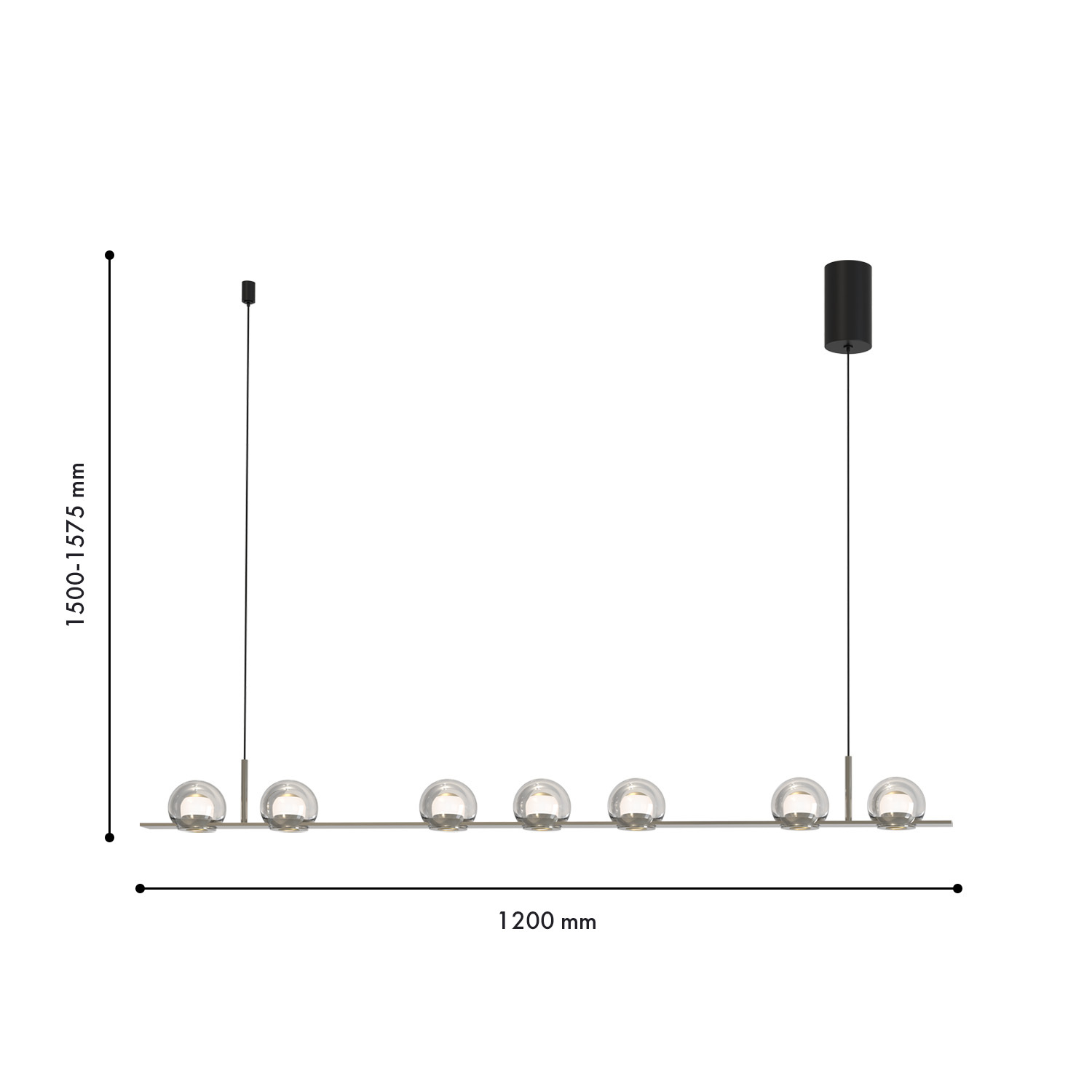 Подвесная люстра с черным каркасом, длиной 120 см с сферическими плафонами, двойной источник света - внутри стеклянного плафона свет направлен вверх, спот в нижней части плафона светит вниз, регулируемая высота