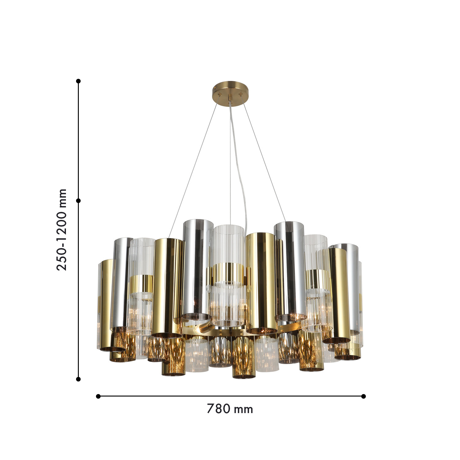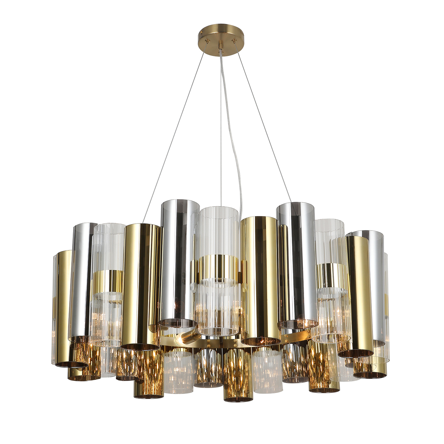 Подвесная люстра с каркасом в цвете золото, декор плафона из стеклянных цилиндров, соединенных между собой, плафоны выполнены в трех цветах: зеркальный хром, зеркальное золото и прозрачный с декоративным рифлением и золотым ободком