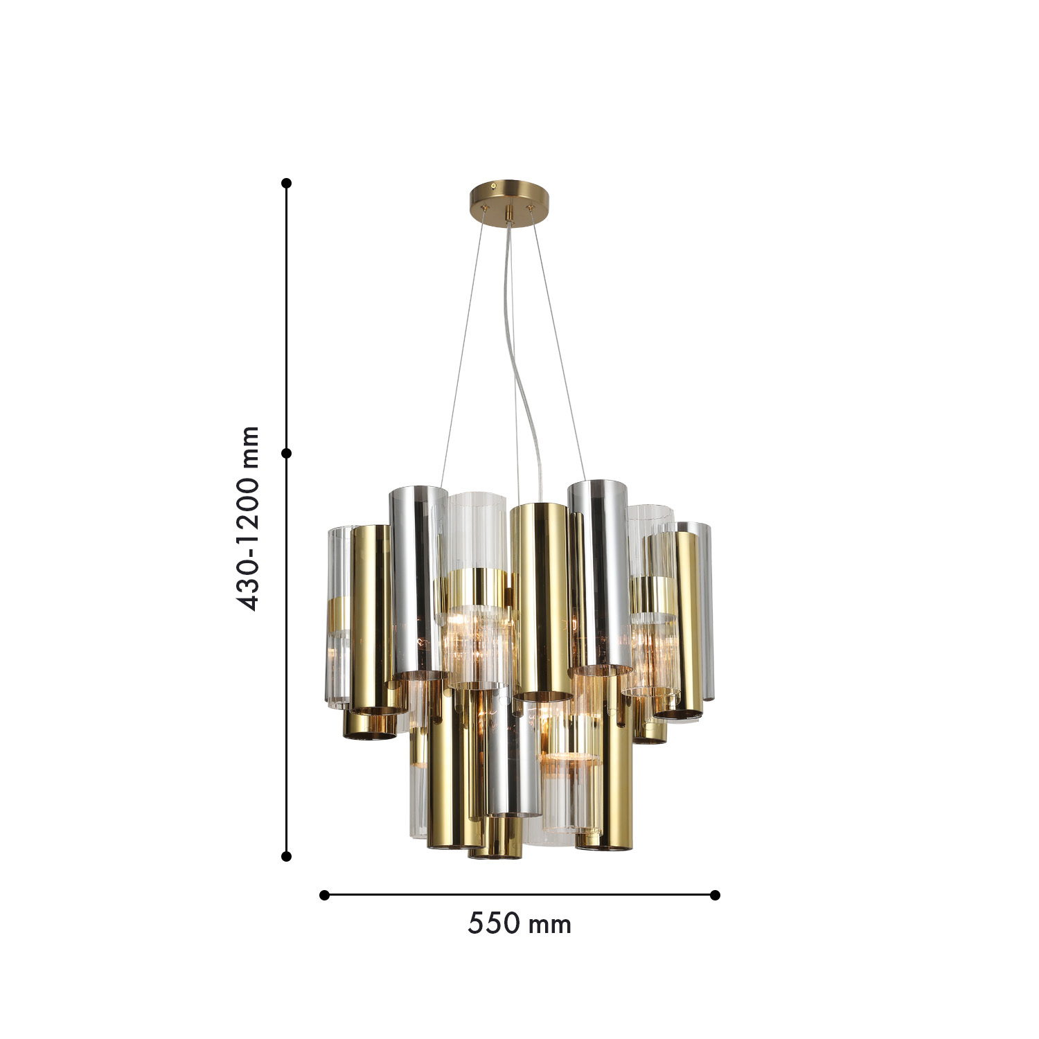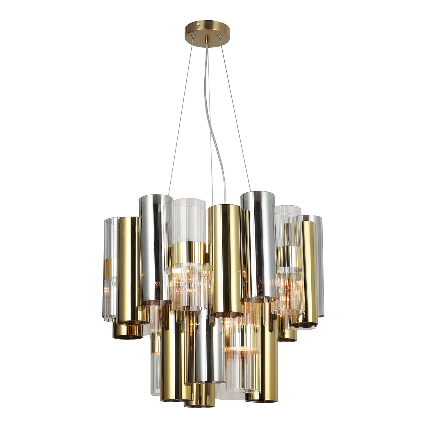 Подвесная люстра с каркасом в цвете золото, декор плафона из стеклянных цилиндров, соединенных между собой, плафоны выполнены в трех цветах: зеркальный хром, зеркальное золото и прозрачный с декоративным рифлением и золотым ободком