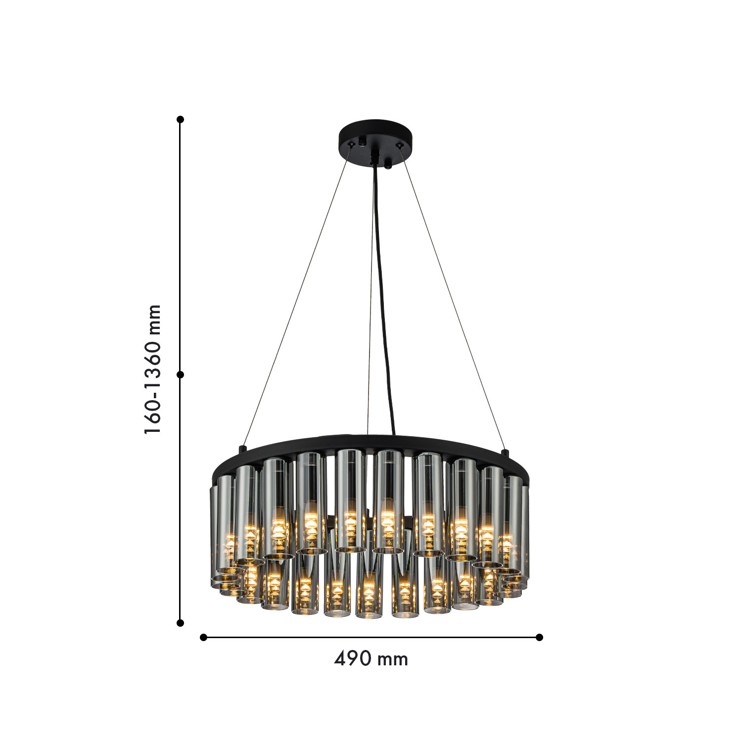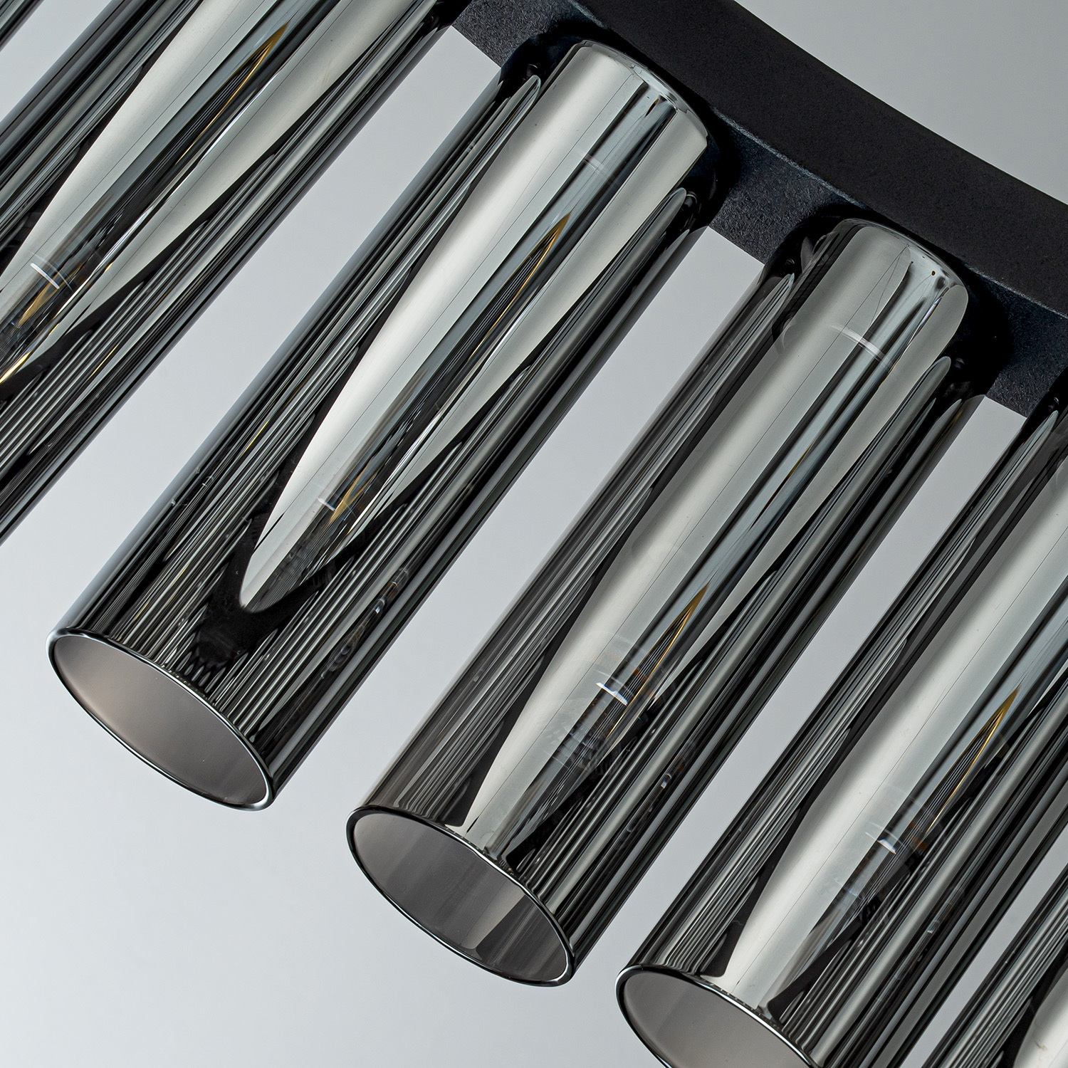 Подвесная люстра, каркас черного цвтеа, плафоны из стекла дымчато-серого цвета цилиндрической формы. Сменные лампы G9. Благодаря универсальным креплениям можно создавать конструкции из 2 или 3 колец.