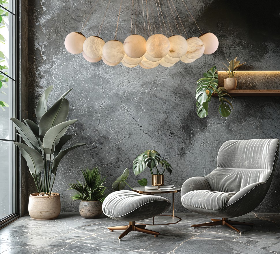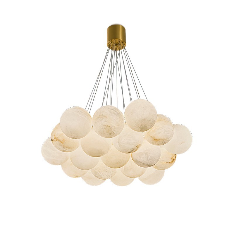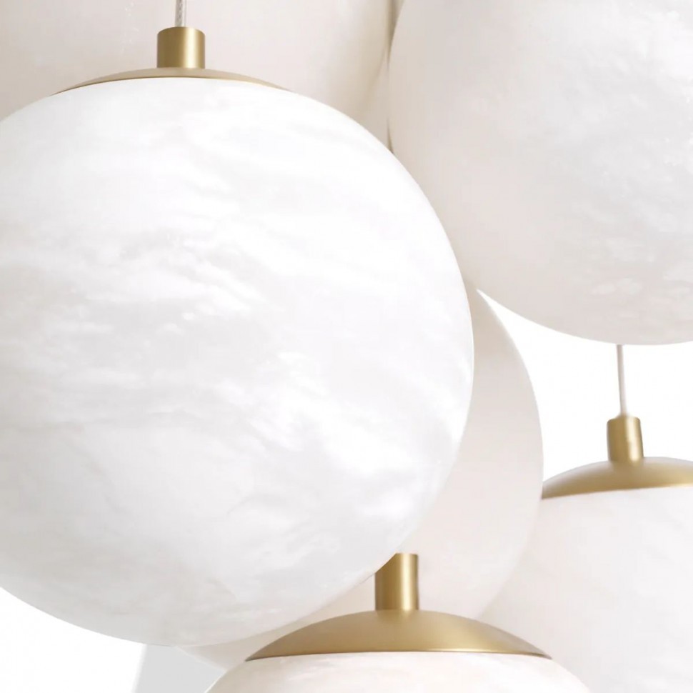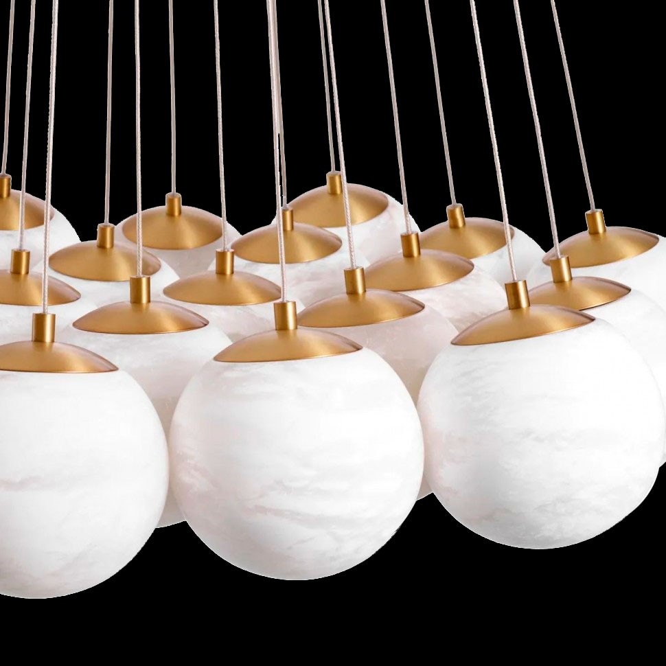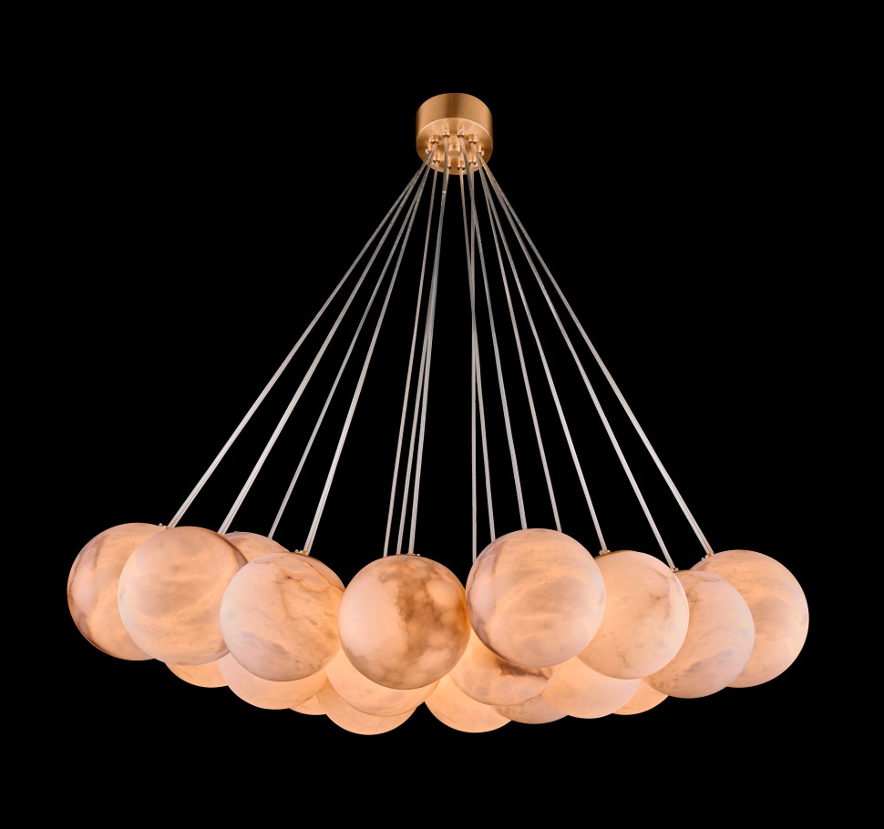 Плафоны выполнены из натурального камня - испанского алебастра. Корпус – из металла с гальваническим покрытием цвета латуни. Коллекция представлена люстрами в двух разных размерах.