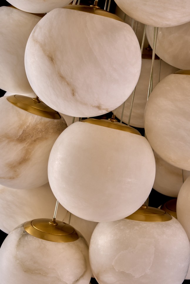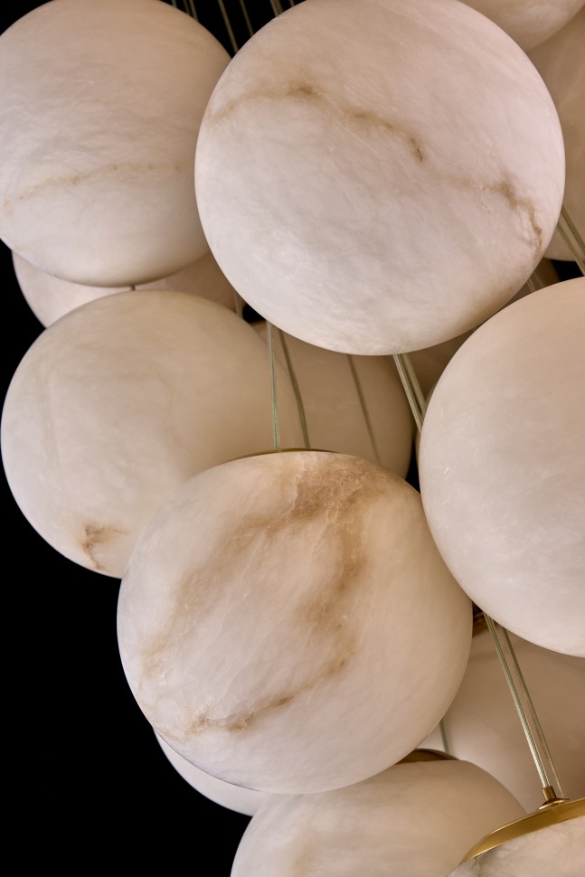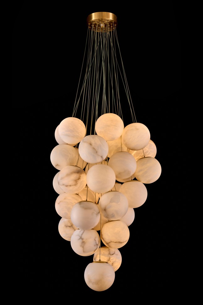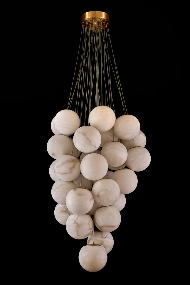 Единство – в красоте. Название коллекции Unity отражает ее дизайнерскую задумку. Светильники состоят из множества плафонов-сфер. Вместе они образуют светящуюся мозаику с четкими контурами. Плафоны выполнены из натурального камня - испанского алебастра. Корпус – из металла с гальваническим покрытием цвета латуни. Коллекция представлена люстрами в двух разных размерах.