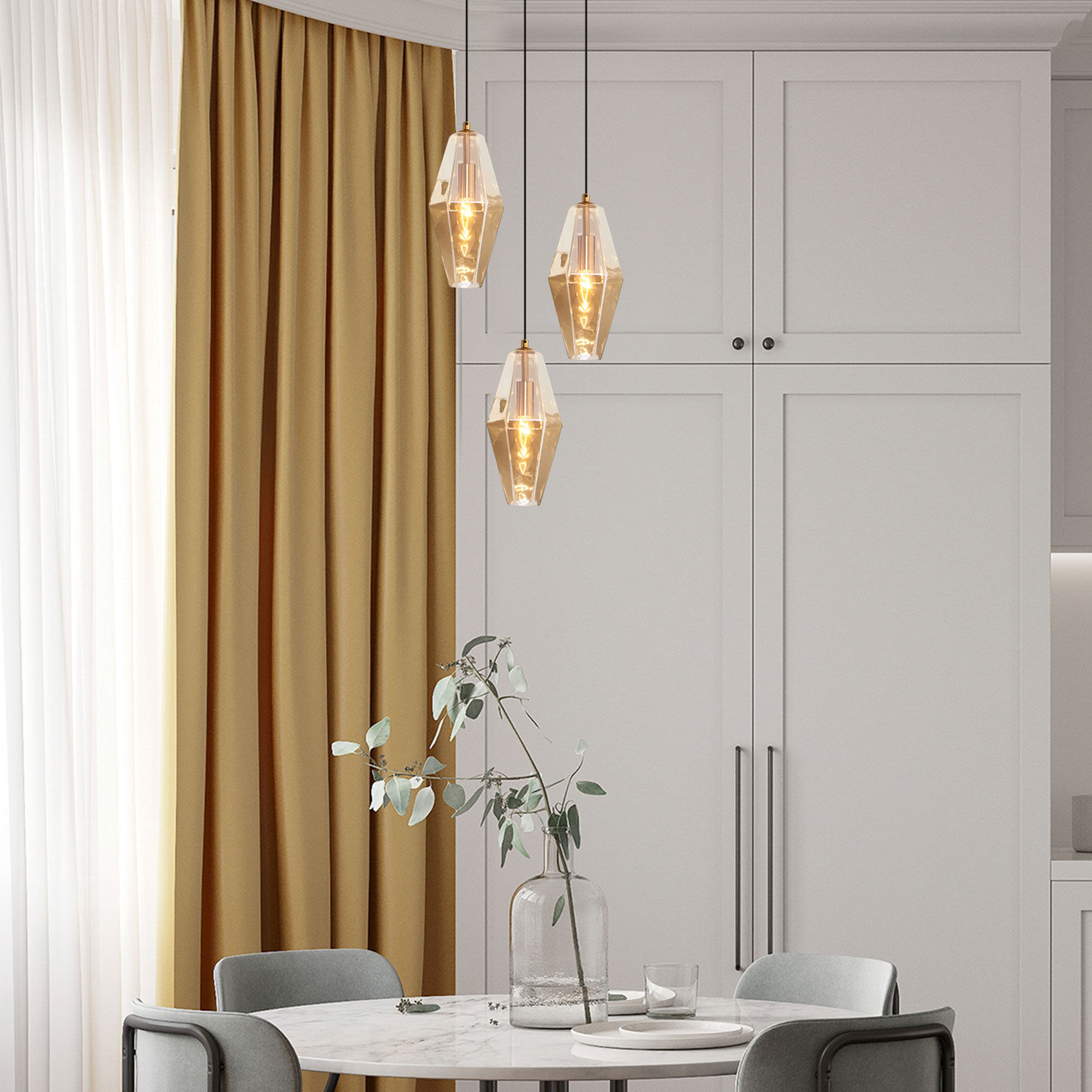 Светильник со стеклянными плафонами оборудован системой регулировки высоты подвеса, позволяющей размещать изделие на разных уровнях, уменьшая или увеличивая угол рассеивания светового потока. Подвесной светильник легко устанавливается на потолке при помощи монтажной планки.