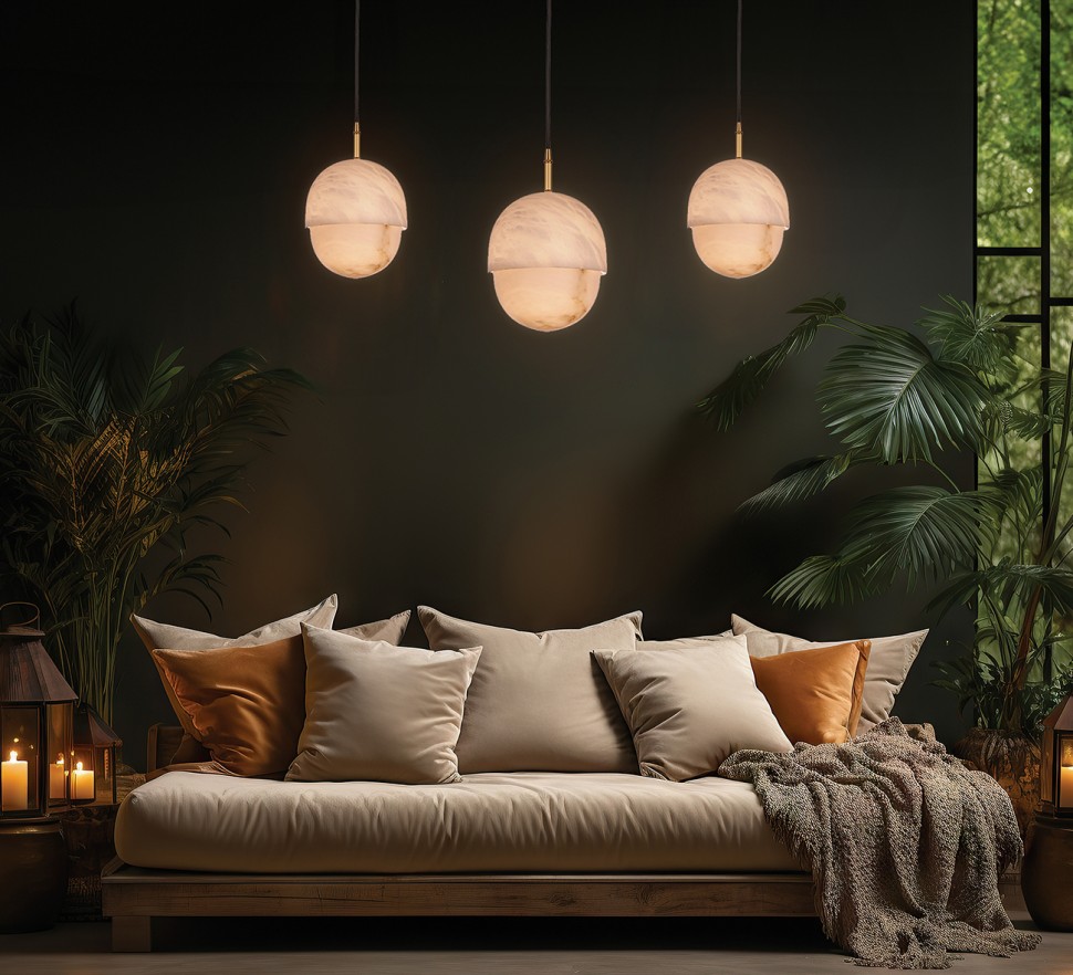 Плафоны выполнены из испанского алебастра. Камень отличается высокой прочностью и способностью красиво пропускать свет. Корпус светильников – из латуни.