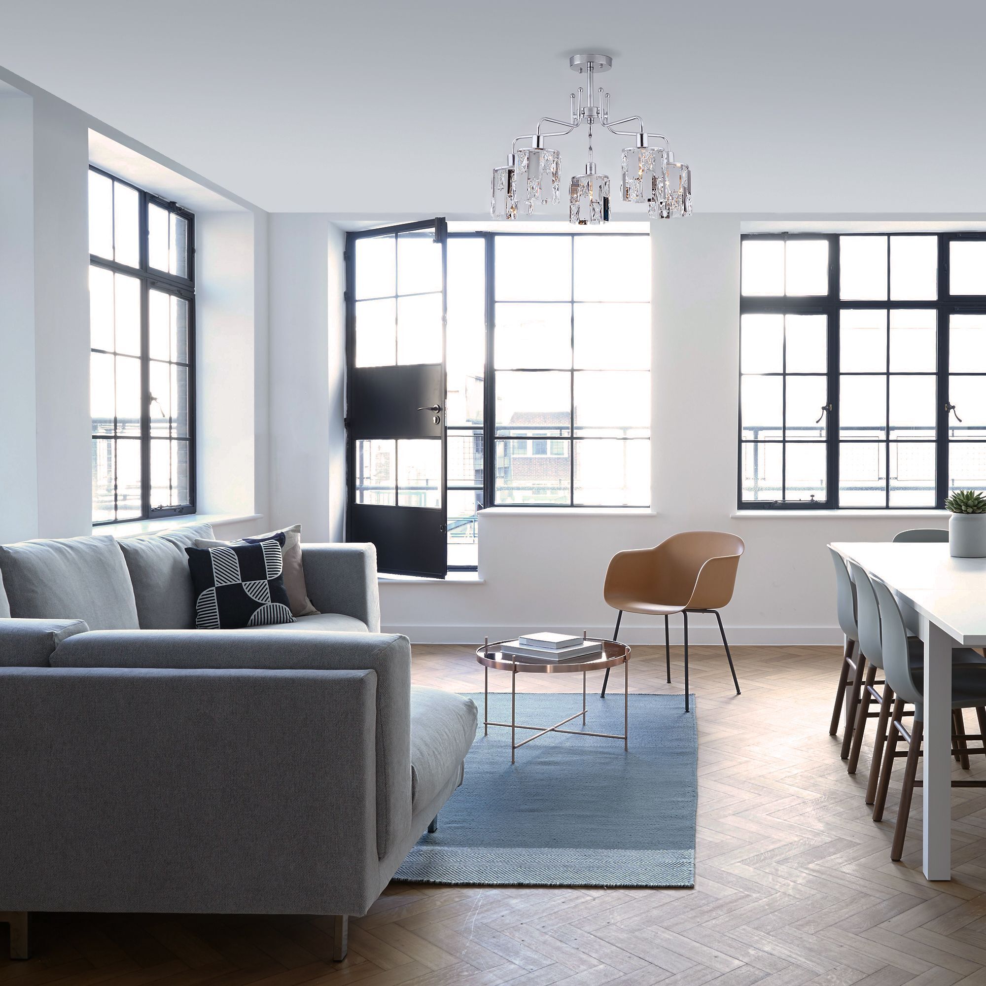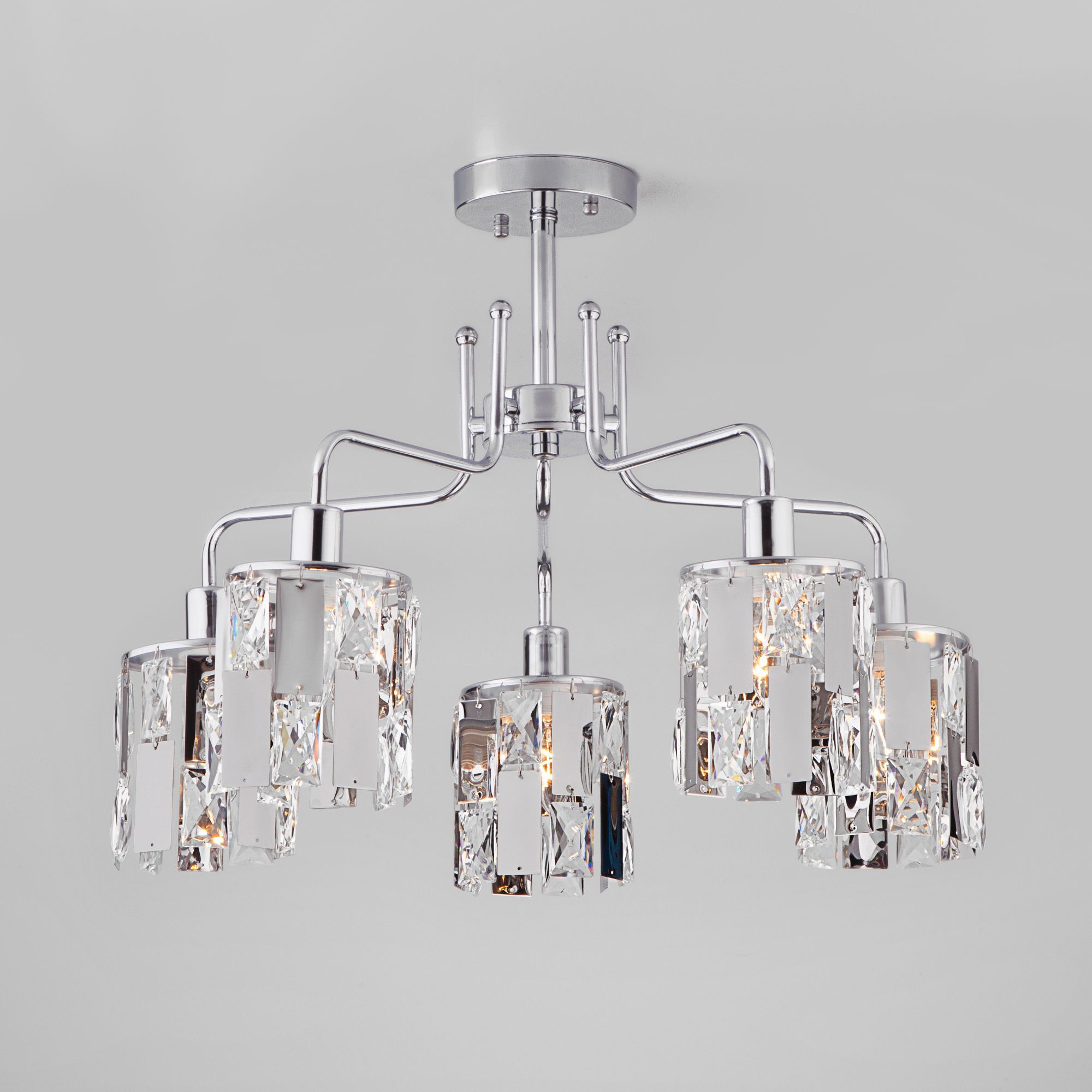 Организовать качественное освещение вам поможет эффектная потолочная люстра с плафонами, выполненными из металла и хрусталя, на 5 рожков в цвете хром. Простые эргономичные формы и умеренные тона станут прекрасным дополнением для вашего интерьера.