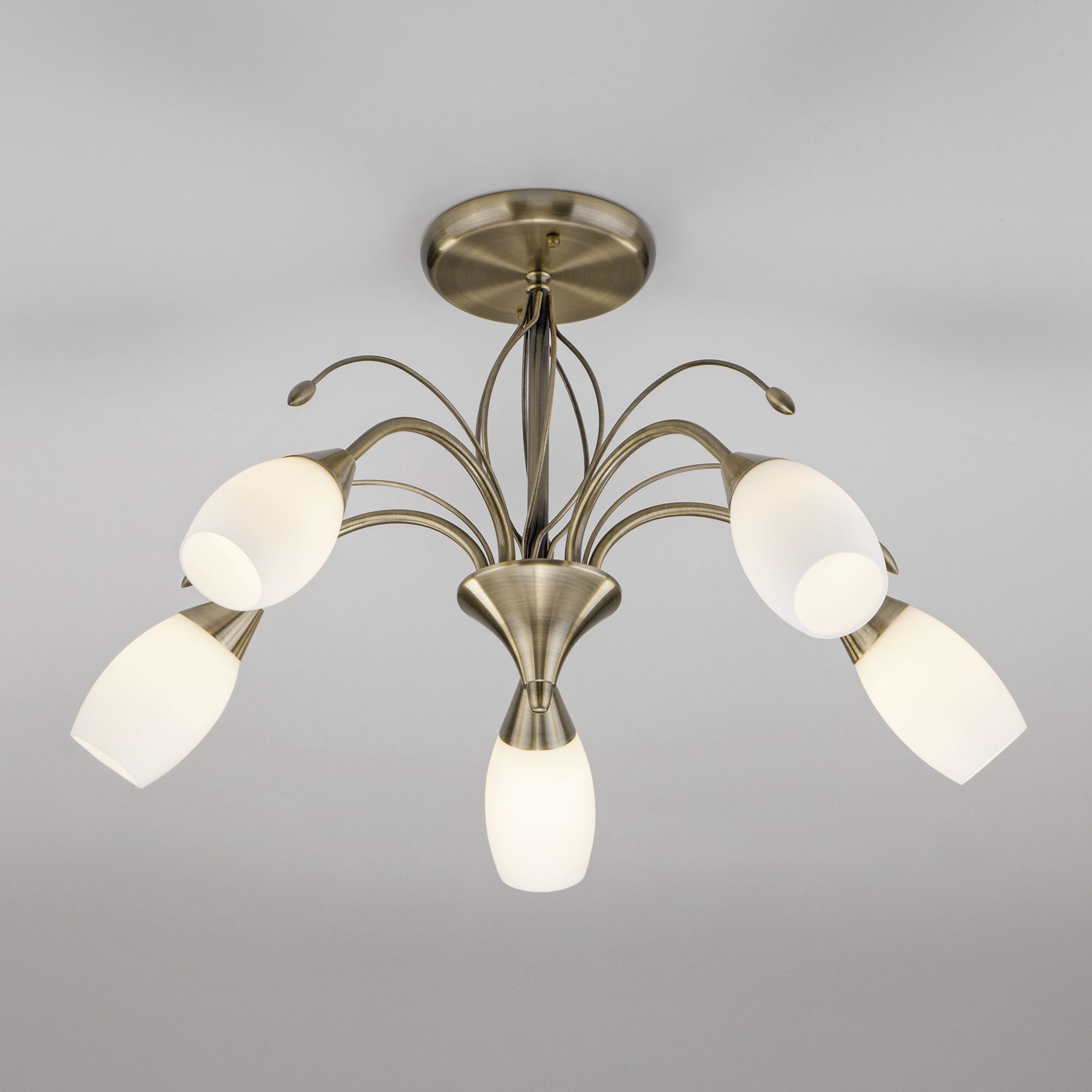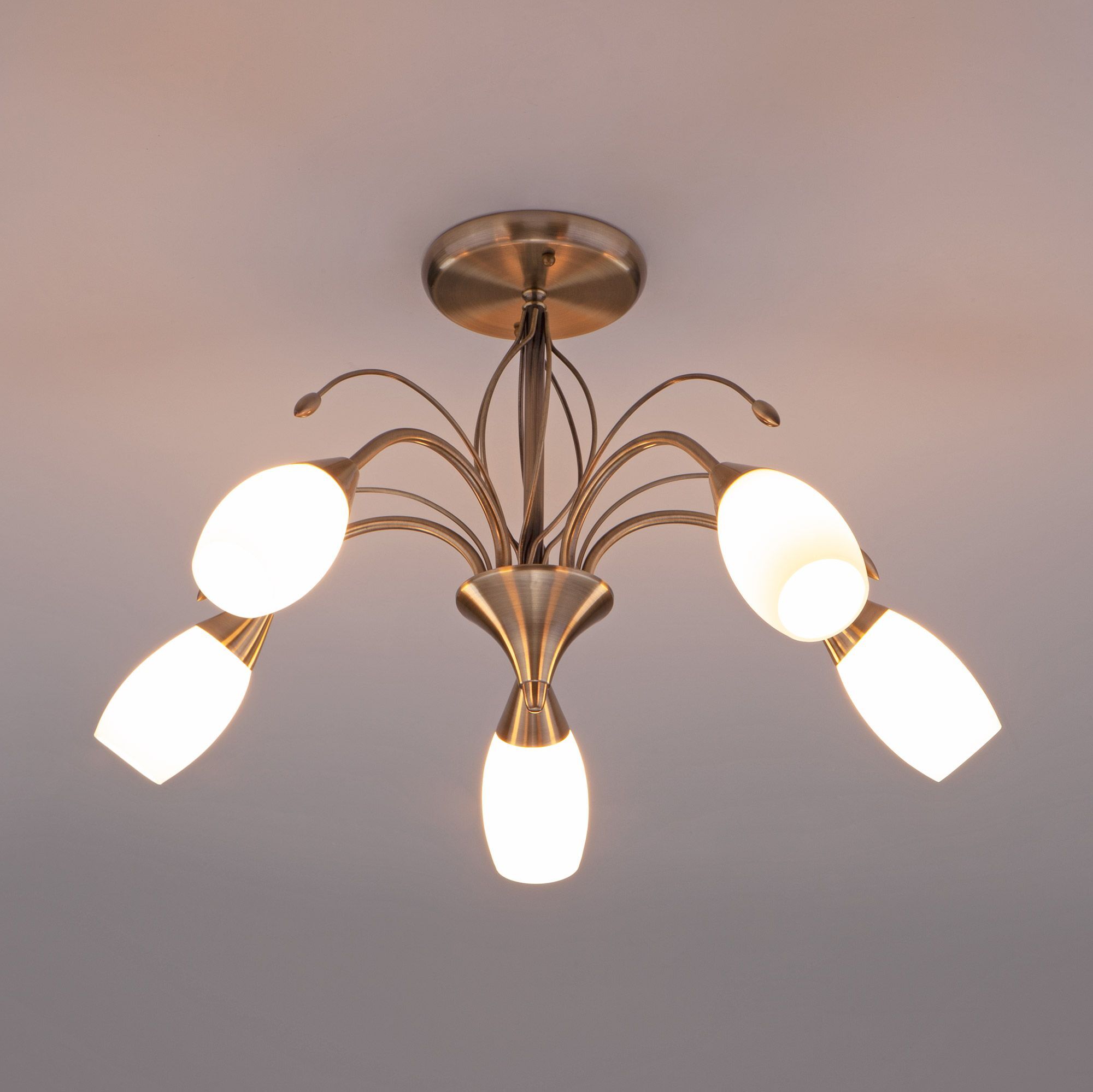 Организовать качественное освещение вам поможет современная потолочная люстра со стеклянными плафонами 30280/5 античная бронза из коллекции Ginevra. Ее изящные линии и бронзовый оттенок арматуры создадут атмосферу благородства и утонченности, а матовые плафоны в форме бутонов одарят мягким, приятным для глаз светом, создавая комфортную и расслабляющую обстановку.