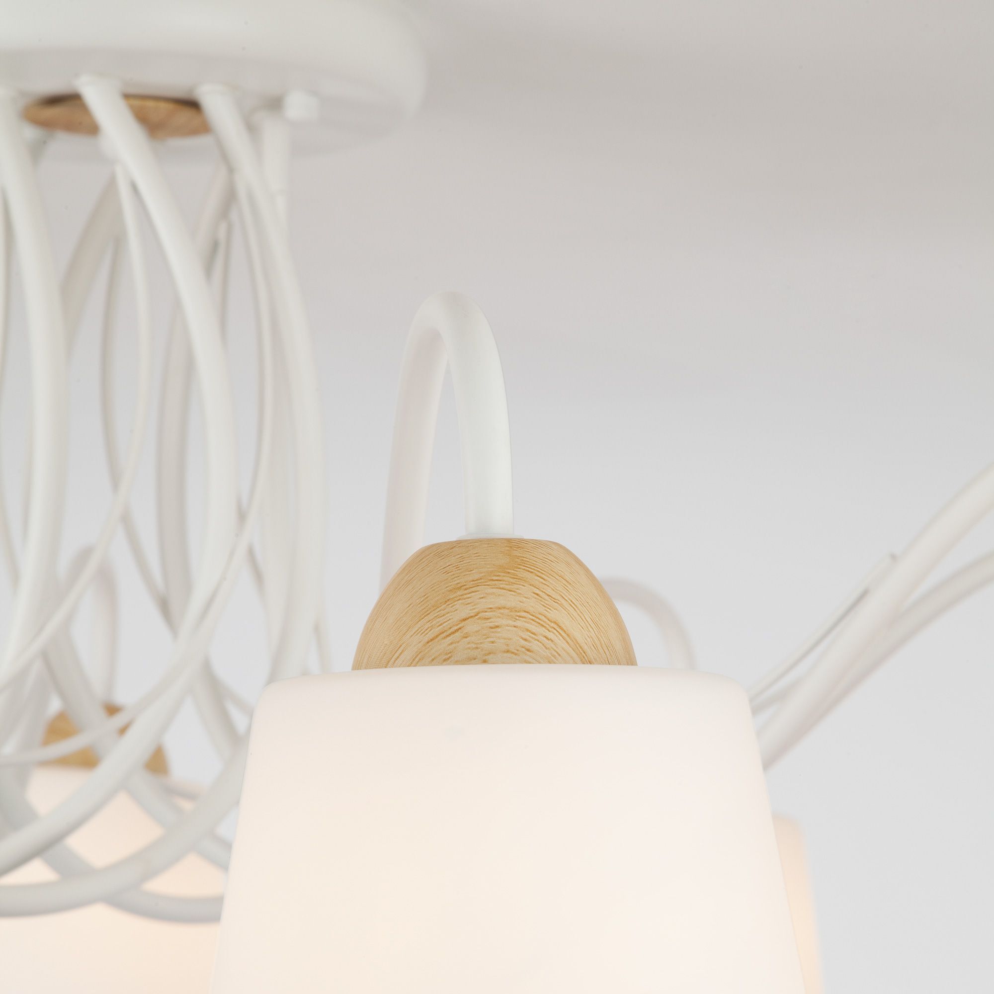 Люстра дополнена матовыми стеклянными плафонами обеспечивающими мягкий, рассеянный свет создавая уютную и комфортную атмосферу в вашей гостиной, спальне или столовой, а плавные линии белого металлического каркаса гармонично сочетающиеся с абажурами конической формы и декоративными элементами, имитирующими натуральное дерево, добавляют нотку скандинавского стиля.