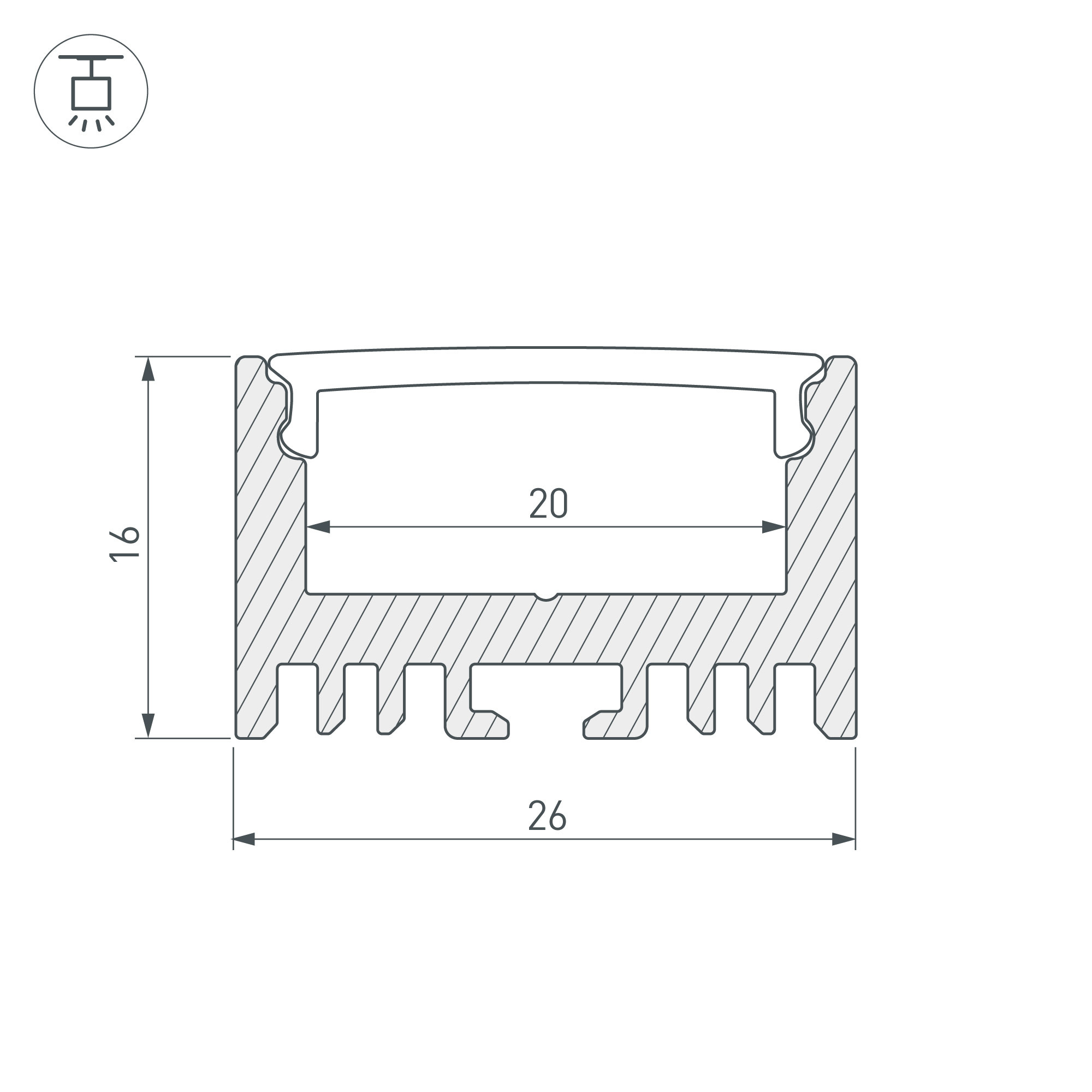 Алюминиевый анодированный подвесной профиль для светодиодных лент и линеек. Габаритные размеры (L×W×H): 2000x26x16 мм. Ширина площадки для ленты 20 мм. Экраны, заглушки и другие аксессуары приобретаются отдельно. Цена за 1 метр.