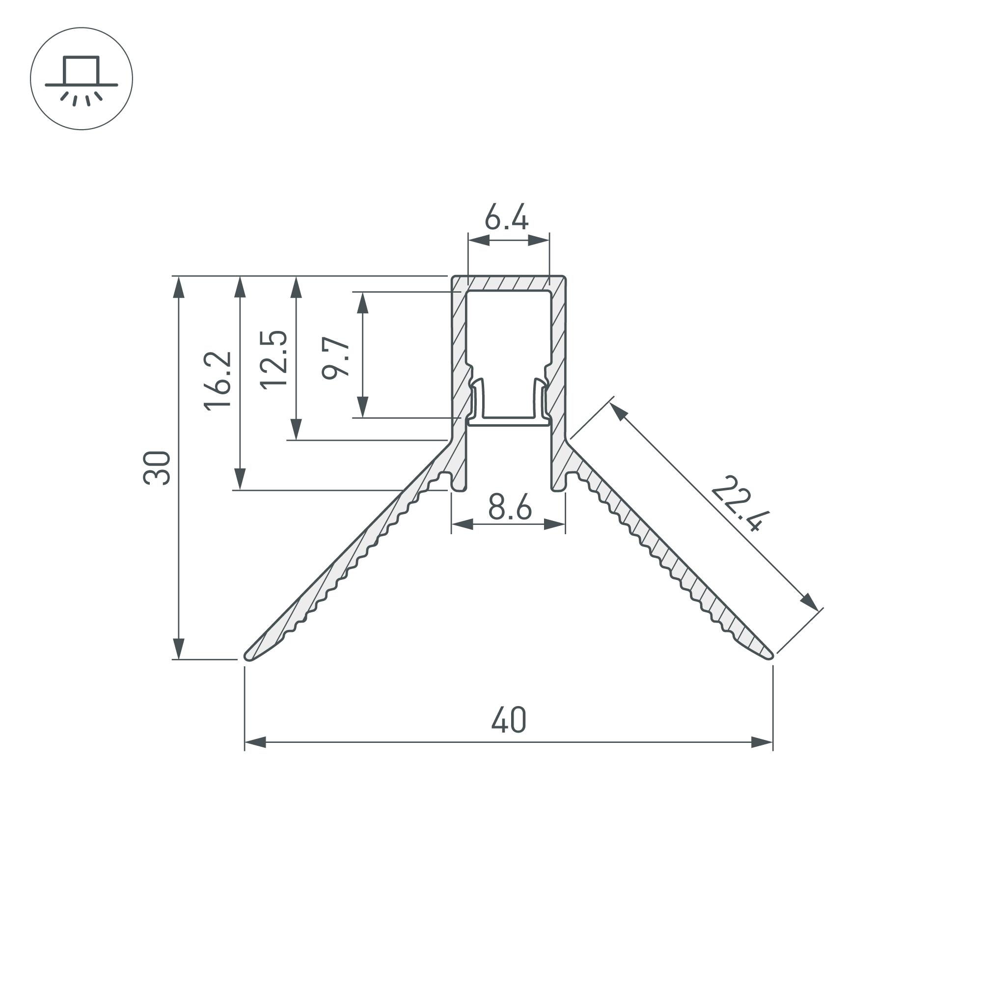 Алюминиевый анодированный угловой профиль для светодиодных лент и линеек, под строительную отделку. Фиксируется при помощи строительной смеси. Декоративная контурная подсветка внутренних углов стен и конструкций. Габаритные размеры (L×W×H): 2000x40x30 мм. Ширина площадки для ленты 6,4 мм. Экраны, заглушки и другие аксессуары приобретаются отдельно. Цена за 1 метр.