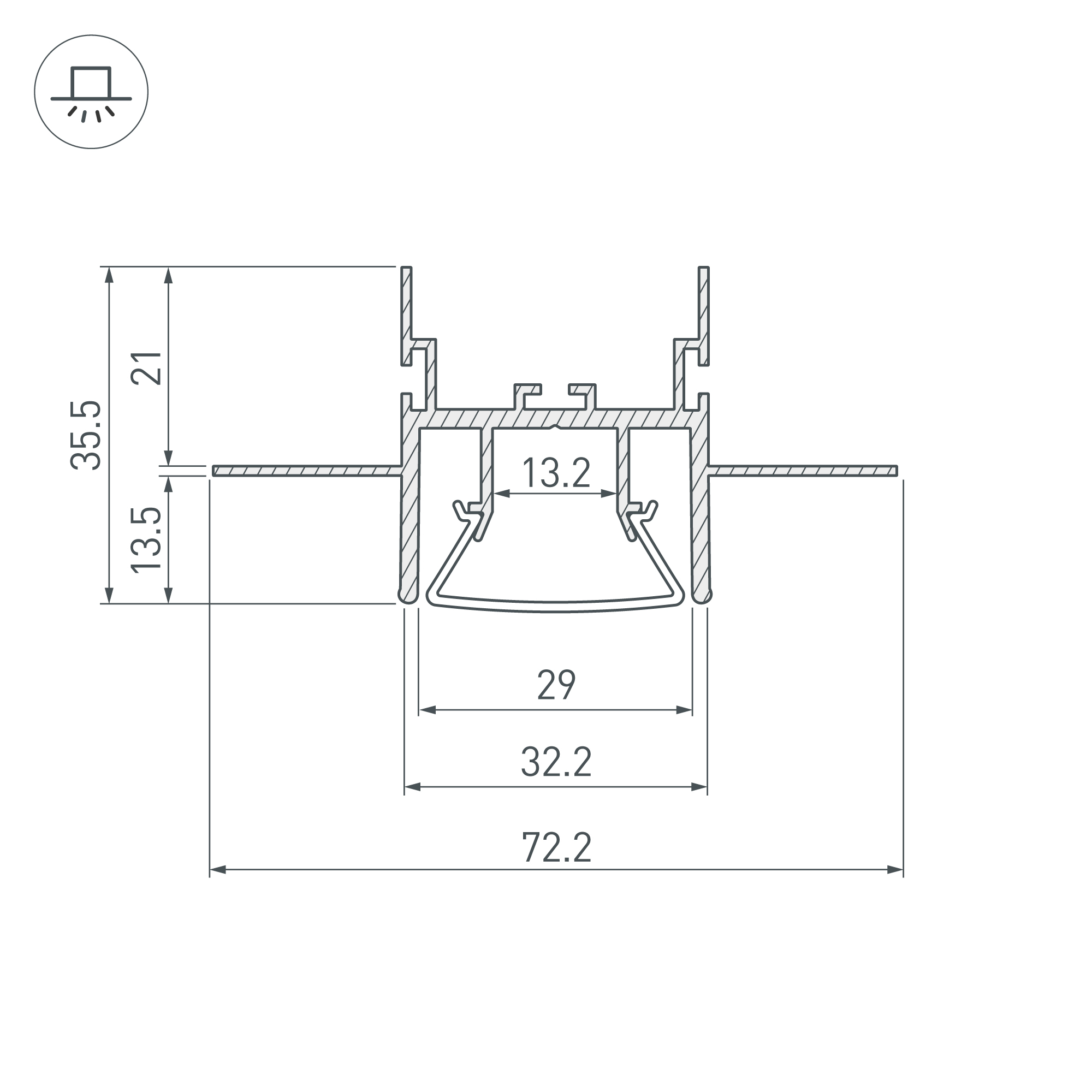 Алюминиевый профиль для натяжных потолков (центральная линия). Решение 2-в-1 - каркас для крепления натяжного потолка и профиль для установки светодиодной ленты. Для дизайнерских решений «линии света» в натяжных потолках. Монтируется к потолку подвесным (с профилем FOLED-RAIL) или накладным способом. Натяжной потолок крепится к одной или к двум боковым стенкам профиля. Габаритные размеры (L×W×H): 2000x72,2x35,5 мм. Ширина площадки для ленты 13,2 мм. Экраны, заглушки и другие аксессуары приобретаются отдельно. Цена за 1 метр.