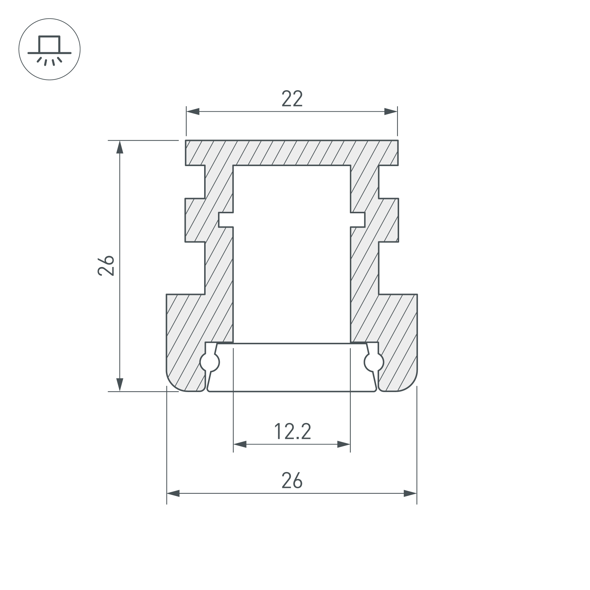 Алюминиевый профиль, встраиваемый в пол. Высокопрочный алюминий (неанодированный). Герметизация до IP67. Может использоваться как внутри помещений, так и снаружи (степень защиты IK10). Габаритные размеры (L×W×H): 2000x26x26 мм. Ширина площадки для ленты 12,2 мм. Экран (из сверхпрочного поликарбоната, УФ-устойчивый), заглушки и другие аксессуары приобретаются отдельно. Цена за 1 метр. Предоставляется видео-инструкция по установке.