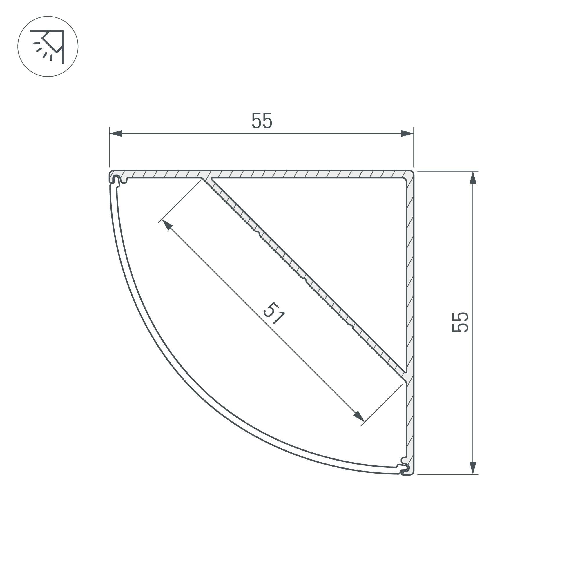 Алюминиевый анодированный угловой профиль для светодиодных лент и линеек. Габаритные размеры (L×W×H): 2000x55x55 мм. Ширина площадки для ленты 51 мм. Экраны, заглушки и другие аксессуары приобретаются отдельно. Цена за 1 метр.