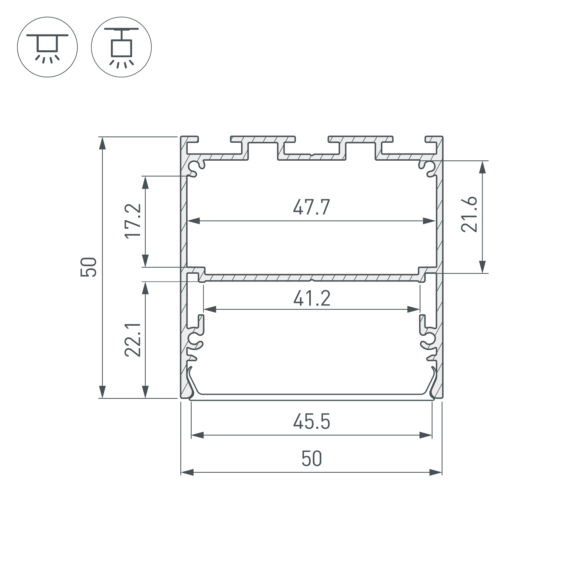 Алюминиевый профиль для светодиодных лент и линеек. Цвет - черный RAL9005 (порошковая окраска). Габаритные размеры (L×W×H): 2000x50x50 мм. Ширина площадки для ленты 41,2 мм. Отсек для БП 40х21,6 мм. Экраны, заглушки и другие аксессуары приобретаются отдельно. Цена за 1 метр.