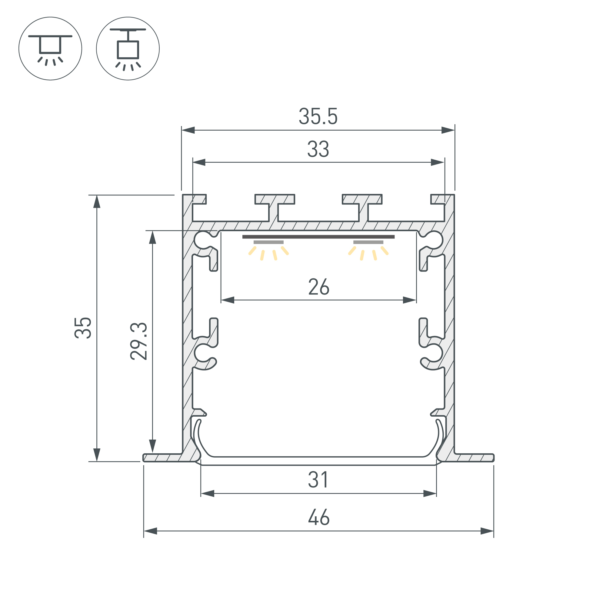 Алюминиевый профиль для светодиодных лент и линеек. Цвет - белый RAL9003 (порошковая окраска). Габаритные размеры (L×W×H): 2500x46x35,5 мм. Ширина площадки для ленты 26 мм. Экраны, заглушки и другие аксессуары приобретаются отдельно. Цена за 1 метр.