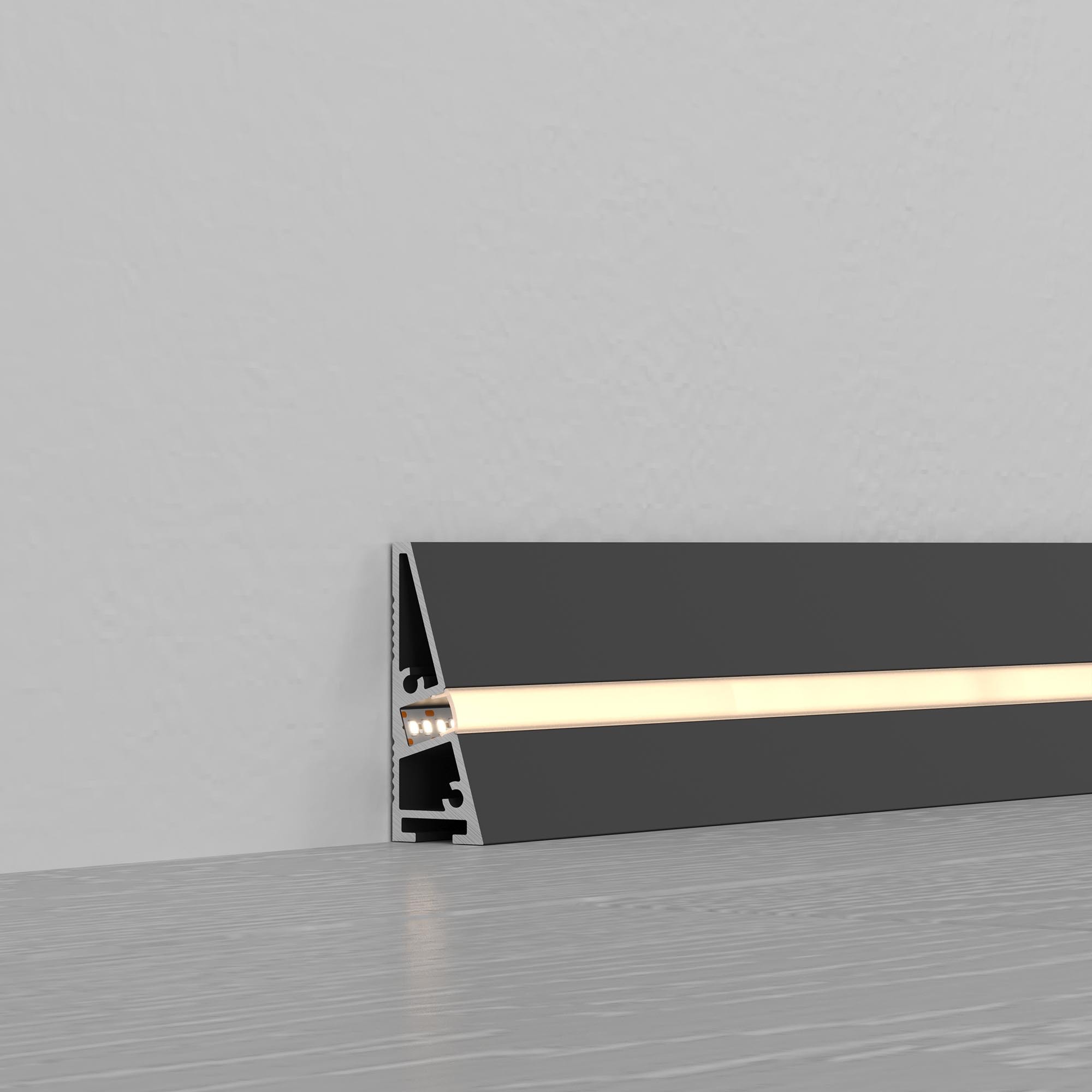 Алюминиевый анодированный профиль-плинтус черного цвета для светодиодных лент и линеек. Габаритные размеры (L×W×H): 2000x15x40 мм. Ширина площадки для ленты 5 мм. Аксессуары приобретаются отдельно. Цена за метр.