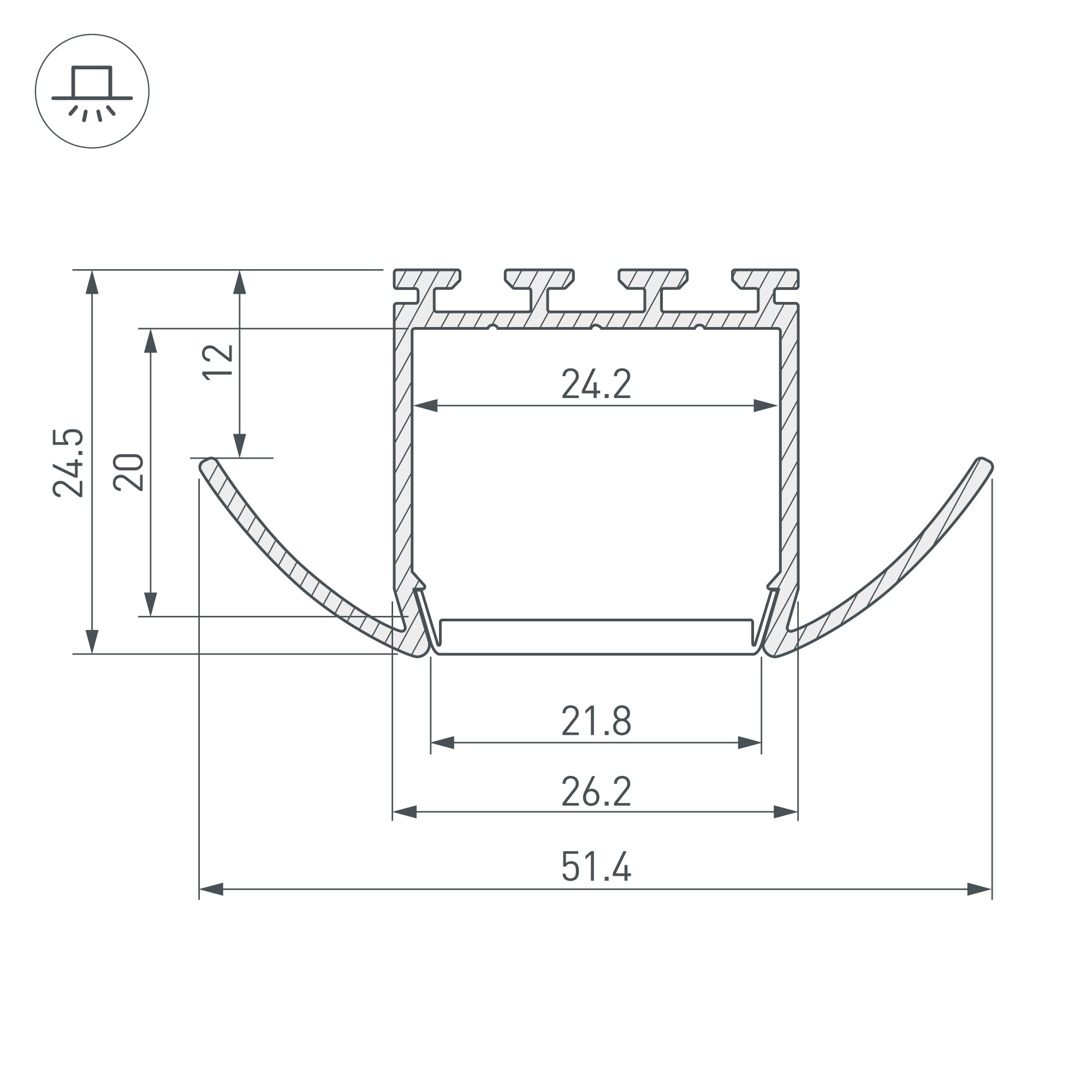 Алюминиевый анодированный профиль для светодиодных лент и линеек. Габаритные размеры (L×W×H): 2000x51,4x24,5 мм. Ширина площадки для ленты 24,2 мм. Экраны, заглушки и другие аксессуары приобретаются отдельно. Цена за 1 метр.