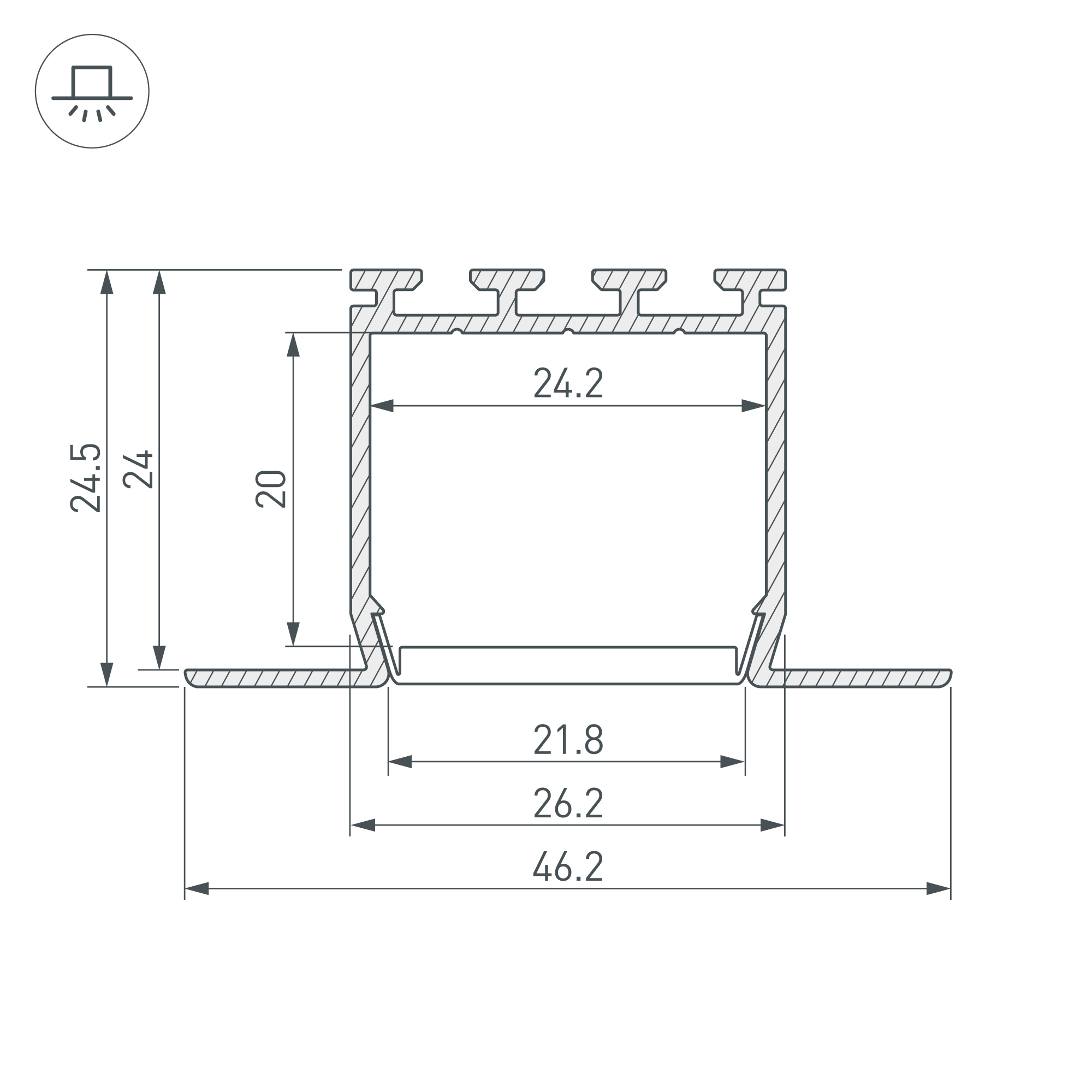 Алюминиевый анодированный профиль для светодиодных лент и линеек. Габаритные размеры (L×W×H): 2000x46,2x24,5 мм. Ширина площадки для ленты 24,2 мм. Экраны, заглушки и другие аксессуары приобретаются отдельно. Цена за 1 метр.