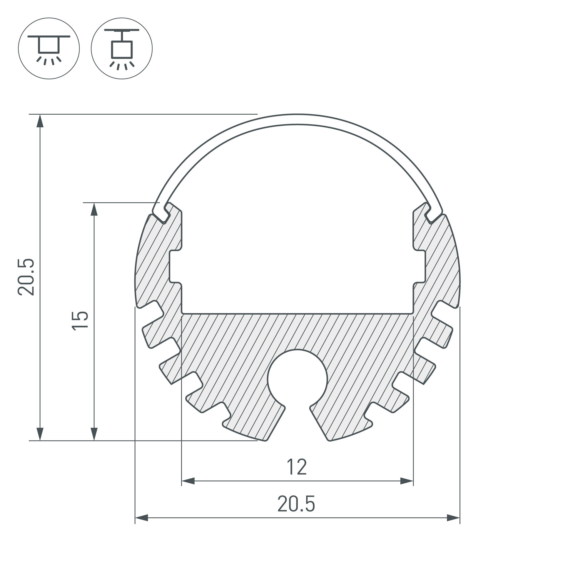 Алюминиевый анодированный круглый профиль для светодиодных лент и линеек. Габаритные размеры профиля (L×W×H): 2000x20,5x15мм. Габаритные размеры профиля с экраном (L×D): 2000xD20,5 мм. Ширина площадки для ленты 12 мм. Экраны, заглушки и другие аксессуары приобретаются отдельно. Цена за 1 метр.