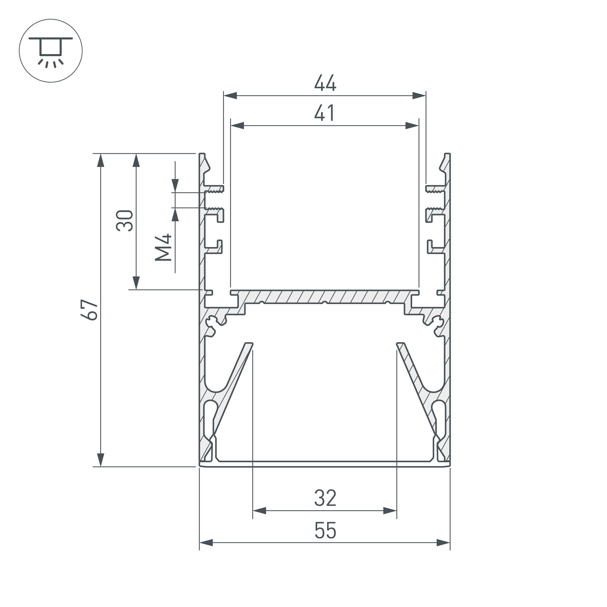 Комплект с экраном. Алюминиевый анодированный профиль для светодиодных лент и линеек, с отсеком для блока питания. Размер отсека 29х44мм. Габаритные размеры (L×W×H): 2000x55x67,4 мм. Ширина площадки для ленты 32,3 мм. Аксессуары приобретаются отдельно. Цена за комплект: профиль - 2 м, экран - 2 м.