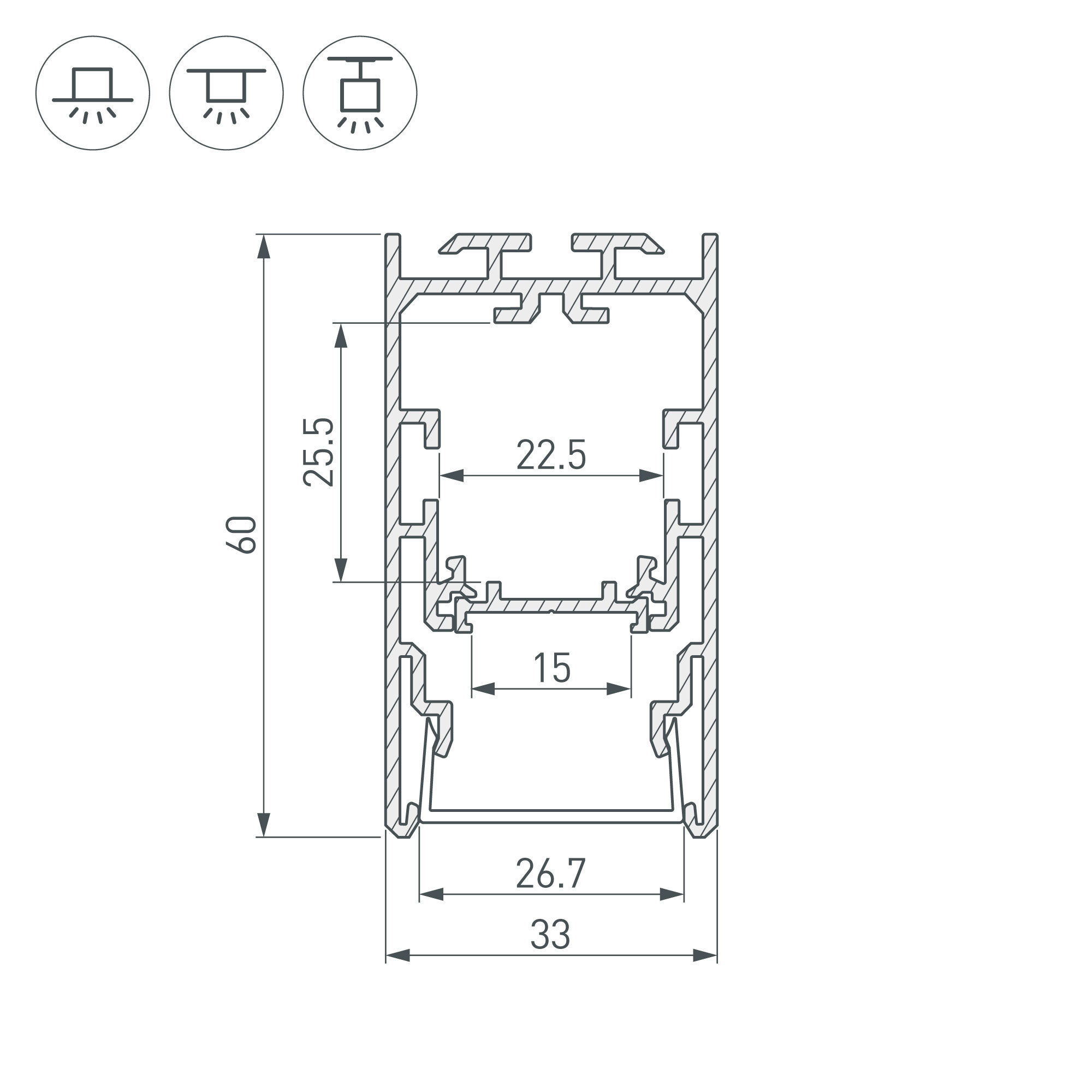 Комплект с экраном. Алюминиевый анодированный профиль для светодиодных лент и линеек. Габаритные размеры (L×W×H): 2500x33x60 мм. В комплекте профиль, основание для ленты, PC матовый экран, фиксаторы основания 4 шт, винты 3 шт. Отсек для БП 21х24мм (±1 мм). Ширина площадки для ленты 15 мм. Светопропускание экрана 85%. Аксессуары приобретаются отдельно. Цена за комплект: профиль - 2,5 м, экран - 2,5 м.