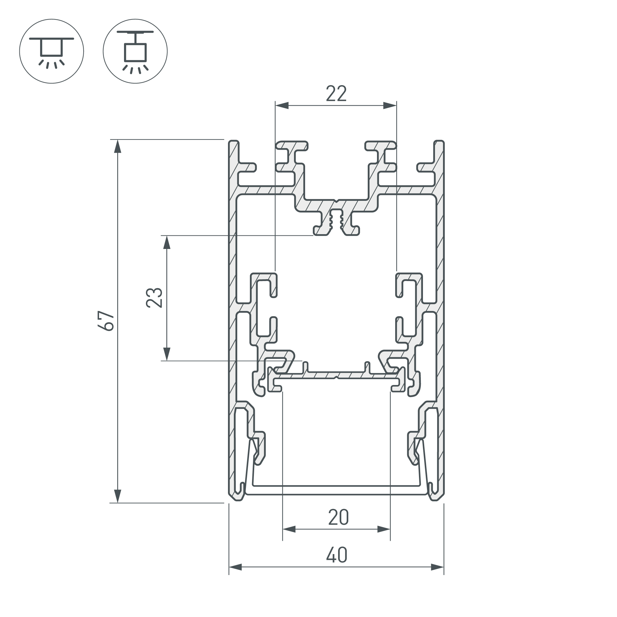 Комплект с экраном. Алюминиевый анодированный профиль для светодиодных лент и линеек. Габаритные размеры (L×W×H): 2500x40x67 мм. В комплекте профиль, основание для ленты, PC матовый экран, фиксаторы основания 4шт, винты. Отсек для БП 22х22мм (±1 мм). Ширина площадки для ленты 20 мм. Светопропускание экрана 85%. Аксессуары приобретаются отдельно. Цена за комплект: профиль - 2,5 м, экран - 2,5 м.