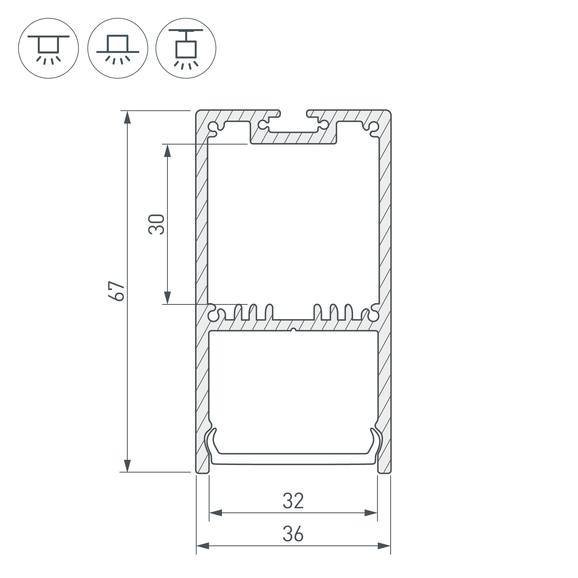 Комплект с экраном. Алюминиевый анодированный профиль для светодиодных лент и линеек. Габаритные размеры (L×W×H): 2500x36x67 мм. Ширина площадки для ленты 32 мм. Отсек для БП 30х32мм. Аксессуары приобретаются отдельно. Цена за комплект: профиль - 2,5 м, экран - 2,5 м.