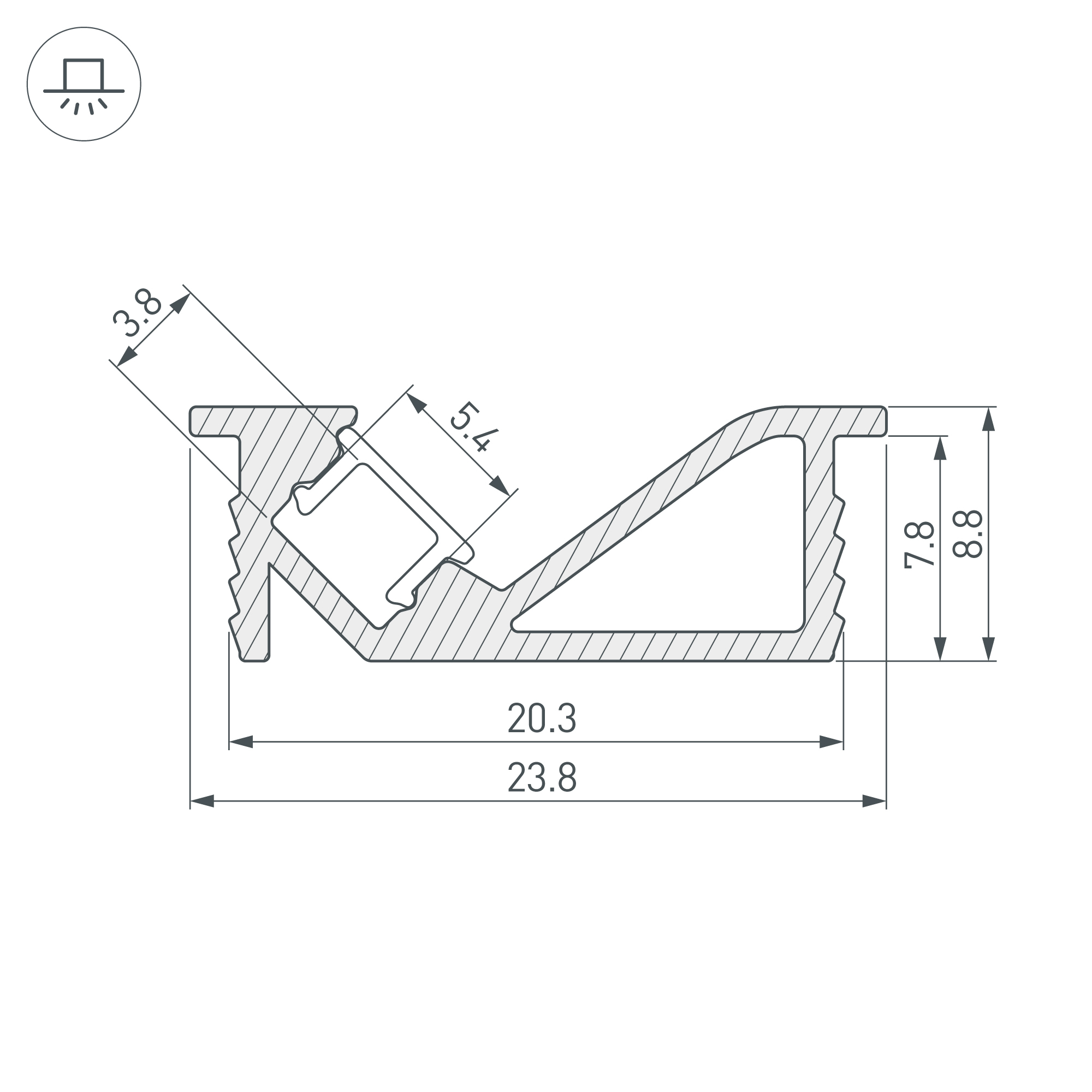 Алюминиевый анодированный профиль для светодиодных лент и линеек с боковым свечением. Габаритные размеры (L×W×H): 2000x23,8x8,8 мм, паз для установки 20,3 мм. Ширина площадки для ленты 5.4 мм. Экраны, заглушки и другие аксессуары приобретаются отдельно. Цена за 1 метр.