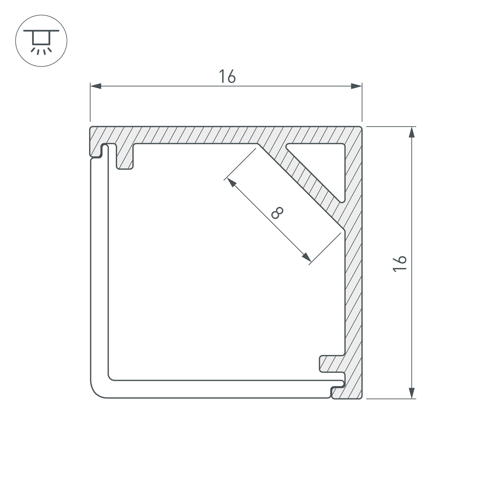 Алюминиевый угловой профиль для светодиодных лент и линеек. Цвет - черный RAL9005 (порошковая окраска). Габаритные размеры (L×W×H): 2000x16x16 мм. Ширина площадки для ленты 8 мм. Экраны, заглушки и другие аксессуары приобретаются отдельно. Цена за 1 метр.