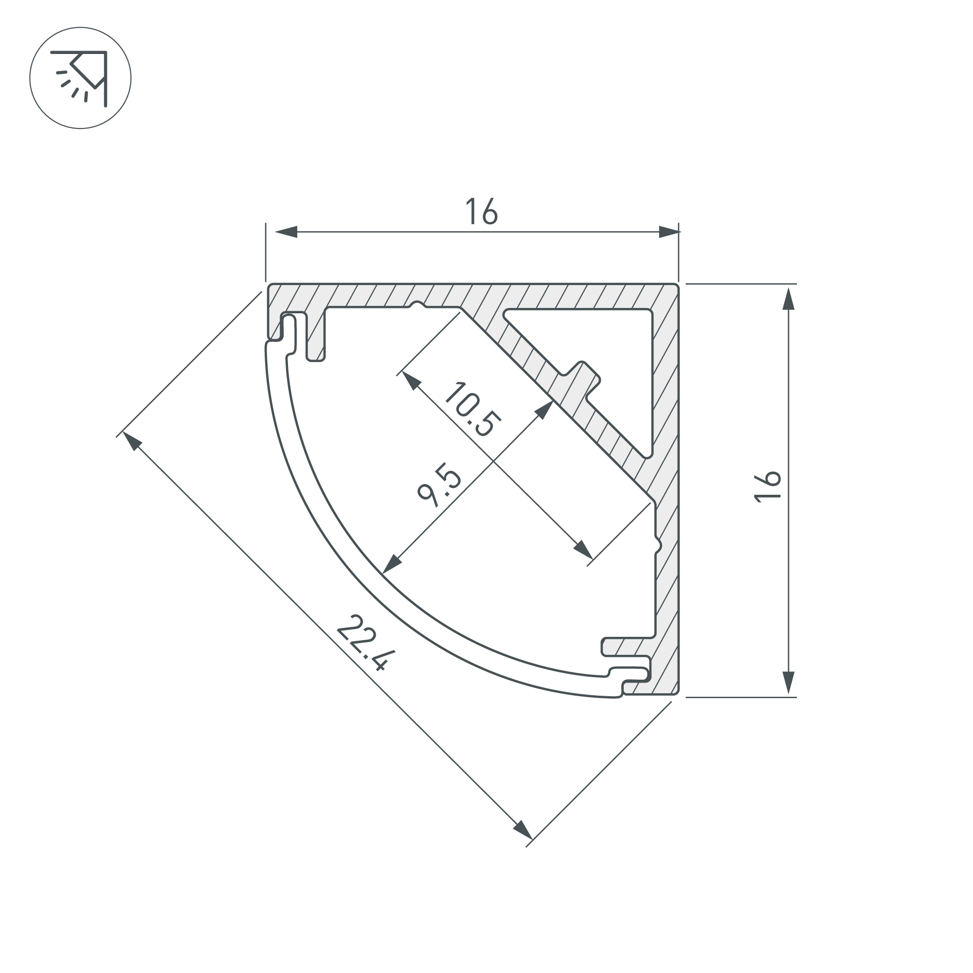 Алюминиевый анодированный угловой профиль для светодиодных лент и линеек. Габаритные размеры (L×W×H): 2000x16x16 мм. Ширина площадки для ленты 10,5 мм. Экраны, заглушки и другие аксессуары приобретаются отдельно. Цена за 1 метр.