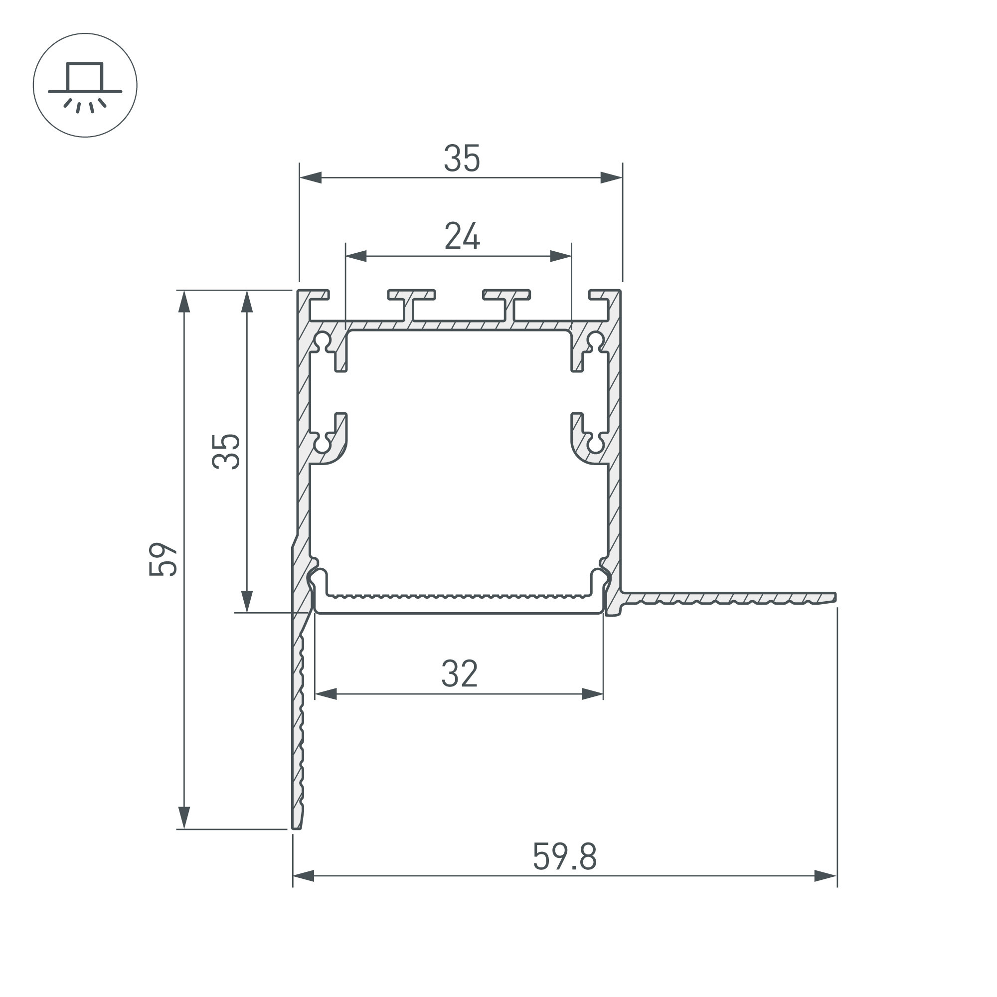 Алюминиевый анодированный профиль для светодиодных лент и линеек. Габаритные размеры (L×W×H): 2000x59,8x59 мм. Паз для установки 35х35 мм. Ширина площадки для ленты 24 мм. Экраны, заглушки и другие аксессуары приобретаются отдельно. Цена за 1 метр.