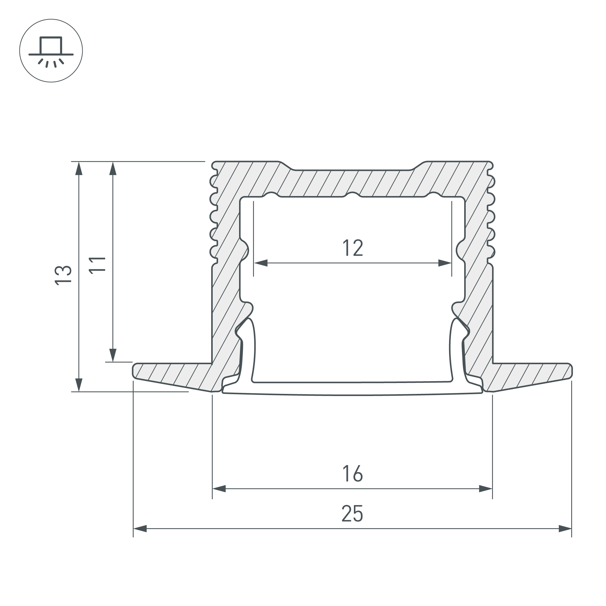 Алюминиевый анодированный профиль для светодиодных лент и линеек. Габаритные размеры (L×W×H): 3000x25x13 мм, паз для установки 16 мм. Ширина площадки для ленты 12 мм. Экраны, заглушки и другие аксессуары приобретаются отдельно. Цена за 1 метр.