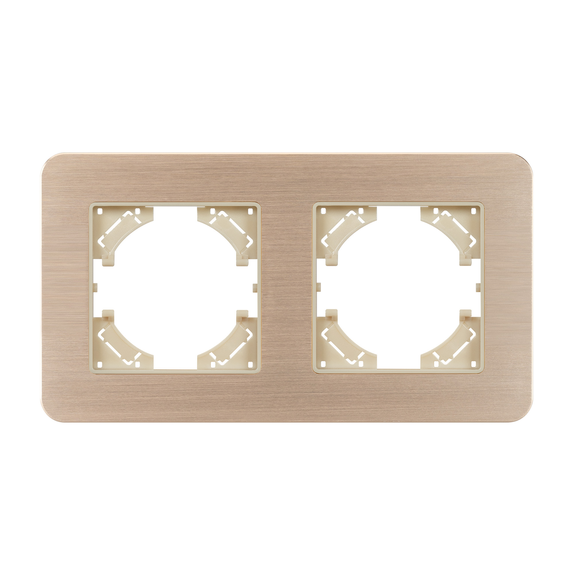Рамка алюминиевая на 2 поста, под встраиваемый механизм. Цвет - золотой. Среднего уровня герметичности IP20. Ориентация монтажа - горизонтальная (основным ориентиром служат посадочные выступы для накладки механизма). Габаритные размеры: длина 157 мм, ширина 86 мм, высота 7 мм. Гарантийный срок 12 мес.
