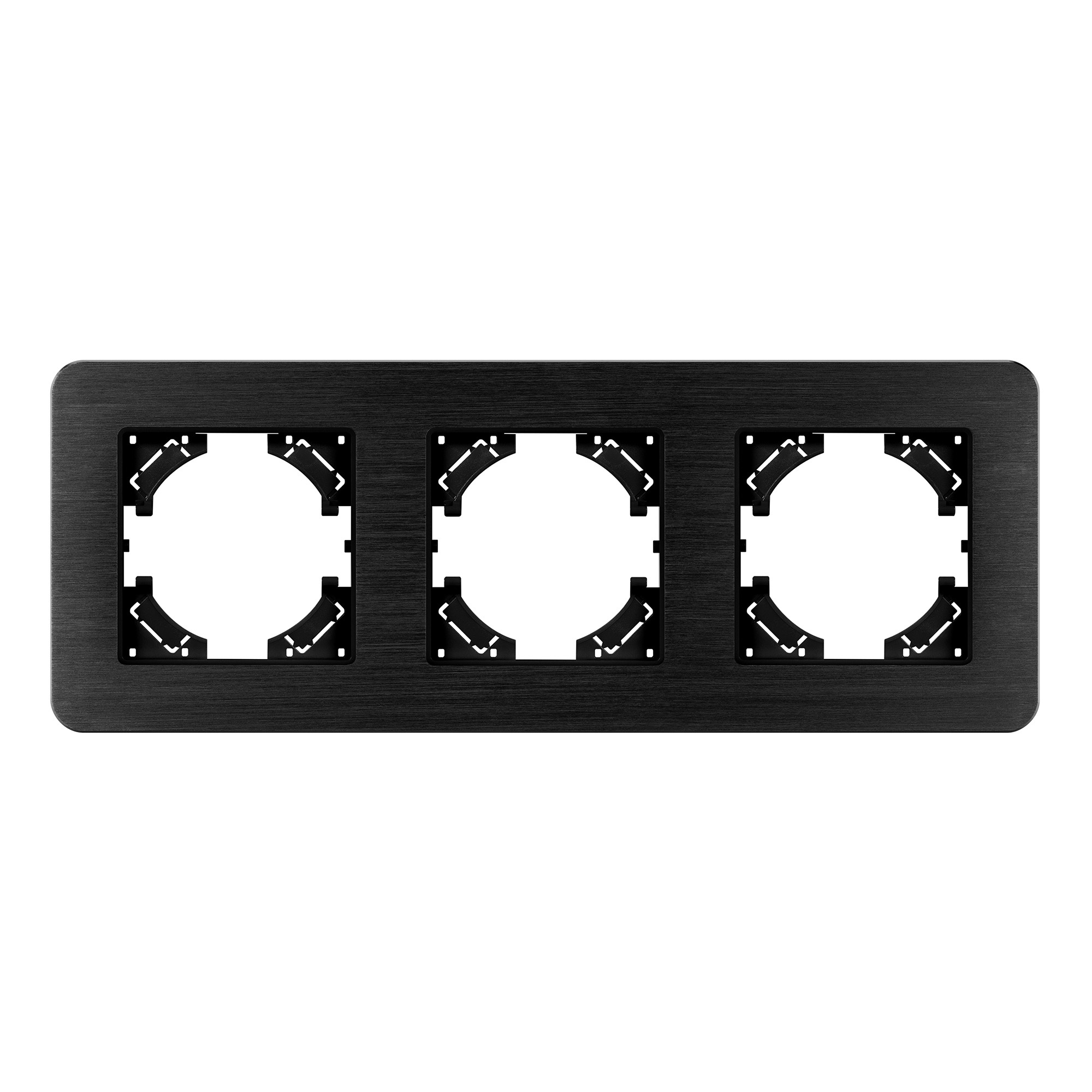 Рамка алюминиевая на 3 поста, под встраиваемый механизм. Цвет - черный. Среднего уровня герметичности IP20. Ориентация монтажа - горизонтальная (основным ориентиром служат посадочные выступы для накладки механизма). Габаритные размеры: длина 228 мм, ширина 86 мм, высота 7 мм. Гарантийный срок 12 мес.